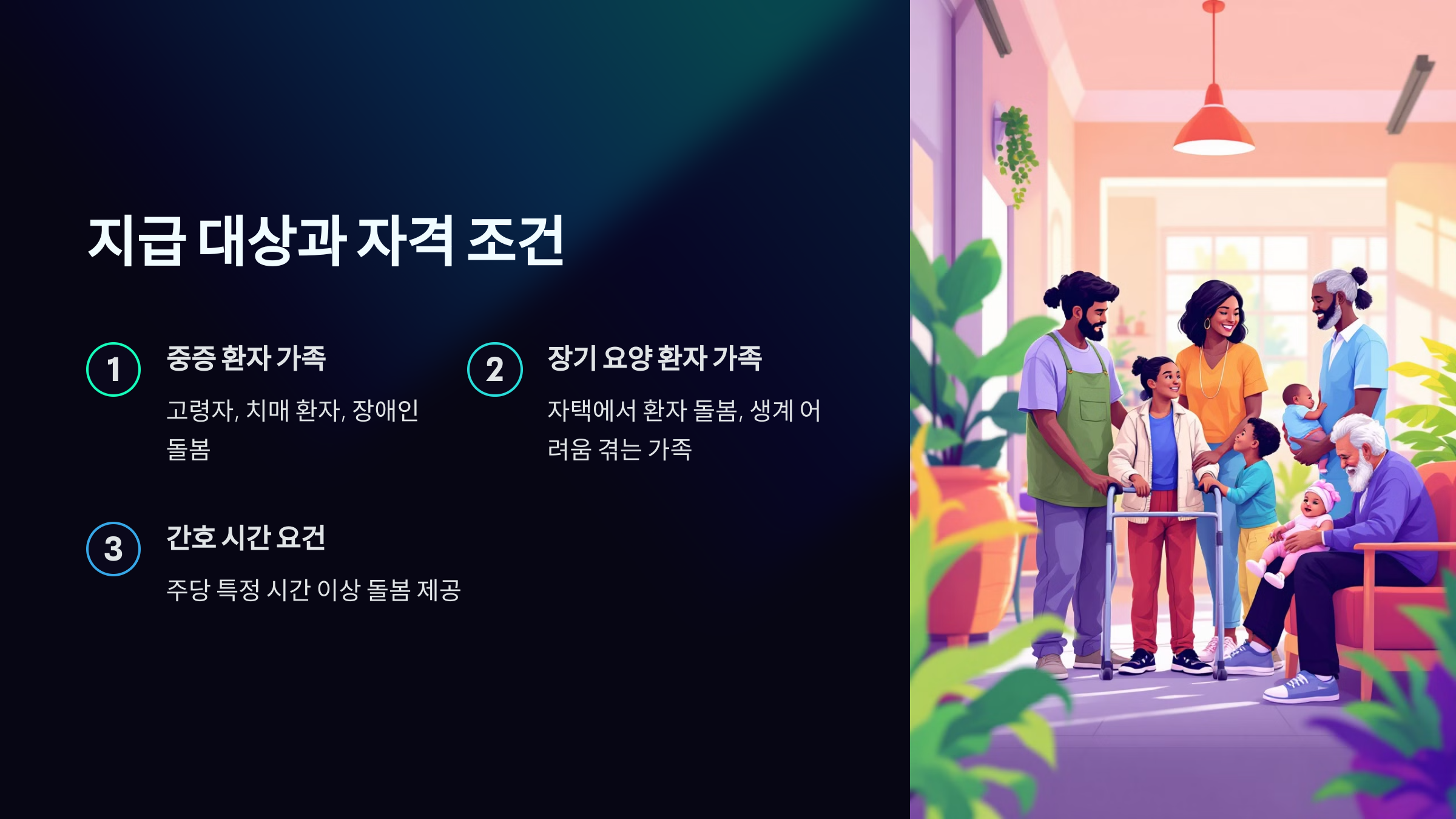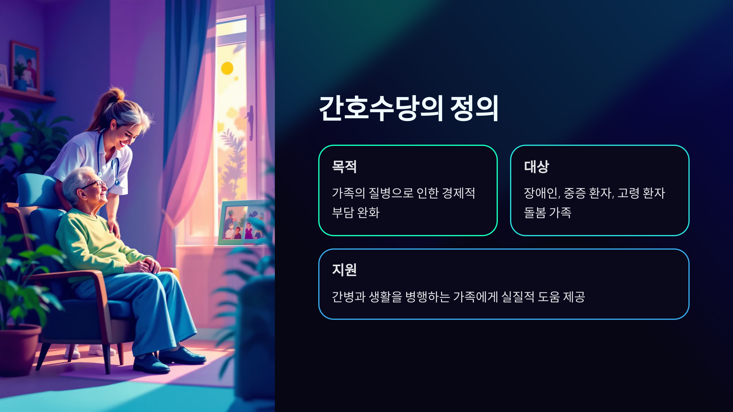 - 중증 환자를 돌보는 가족: 상시 간병이 필요한 고령자, 치매 환자, 또는 장애인이 주된 간호 대상이 됩니다.