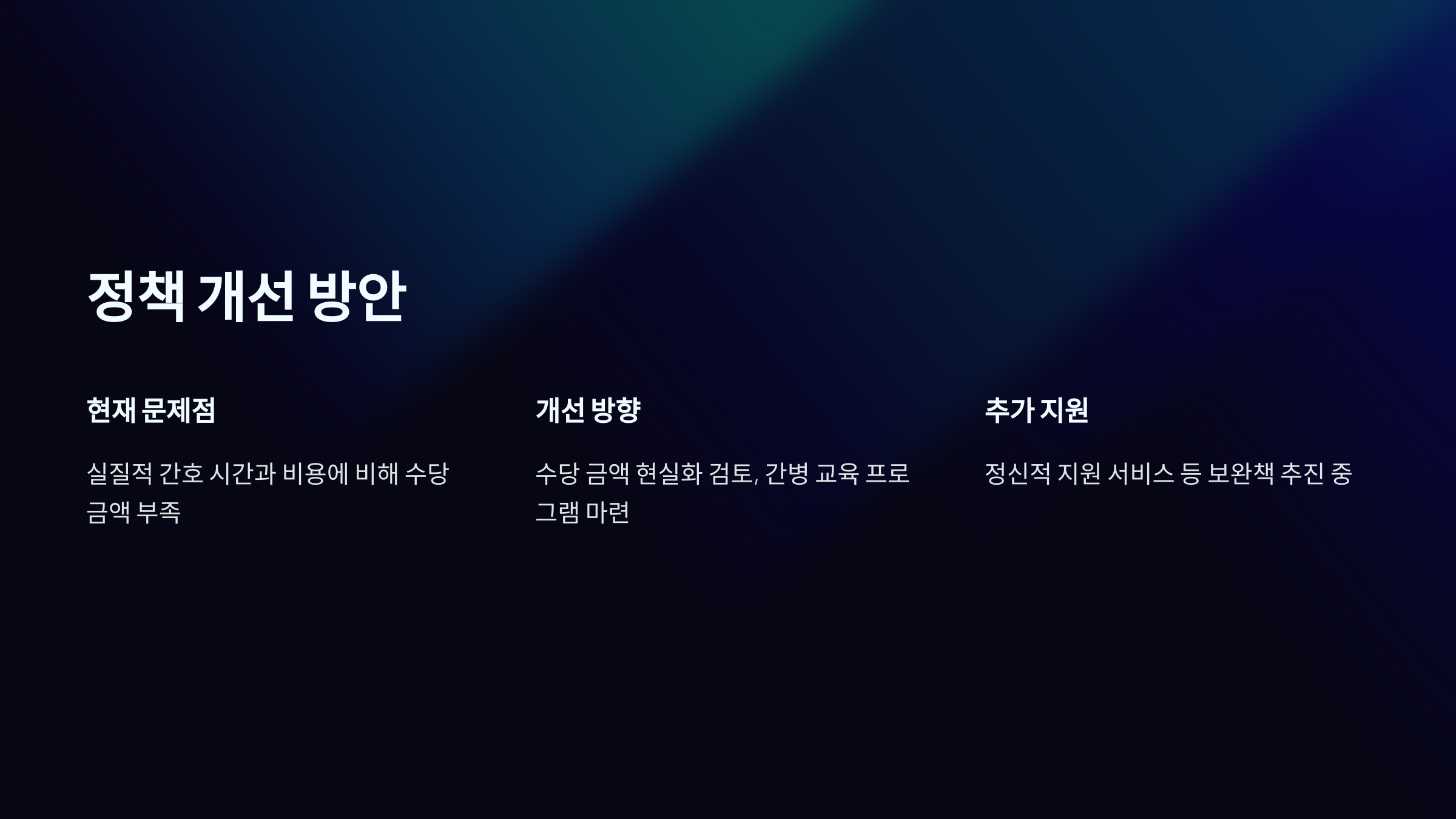 의 부담을 덜어주는 데 중요한 역할을 하고 있지만, 일부 문제점도 존재합니다. 예를 들어, 간병인의 실질적인 간호 시간과 비용에 비해 수당 금액이 부족하다는 의견이 많습니다. 이에 따라 정부는 수당 금액의 현실화를 검토하고 있으며, 간병 교육 프로그램 및 정신적 지원 서비스 등의 보완책 마련을 추진 중입니다.