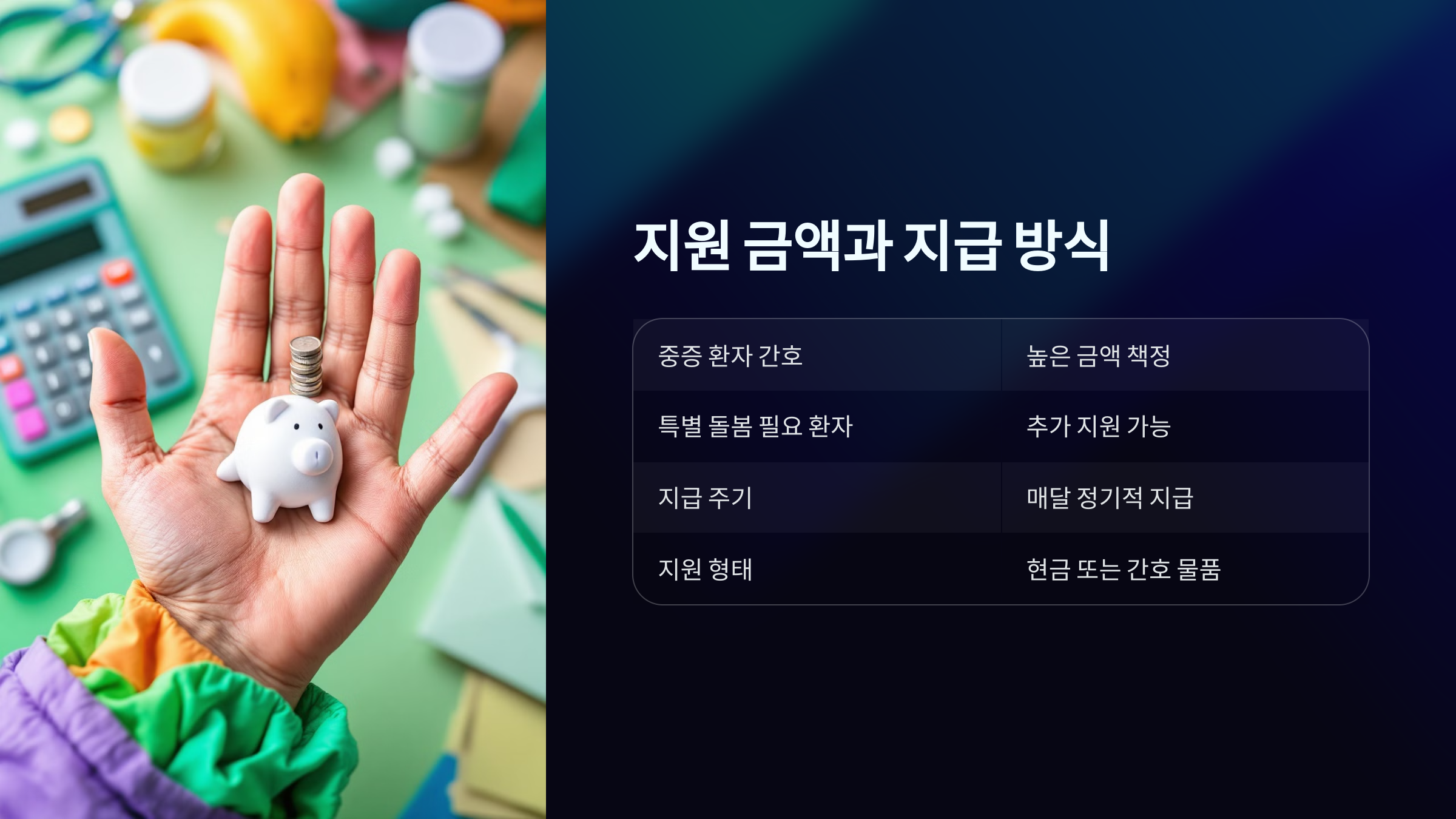 간호수당은 주로 가족 간호를 담당하는 보호자를 위한 제도입니다. 자격 요건과 대상은 아래와 같습니다: