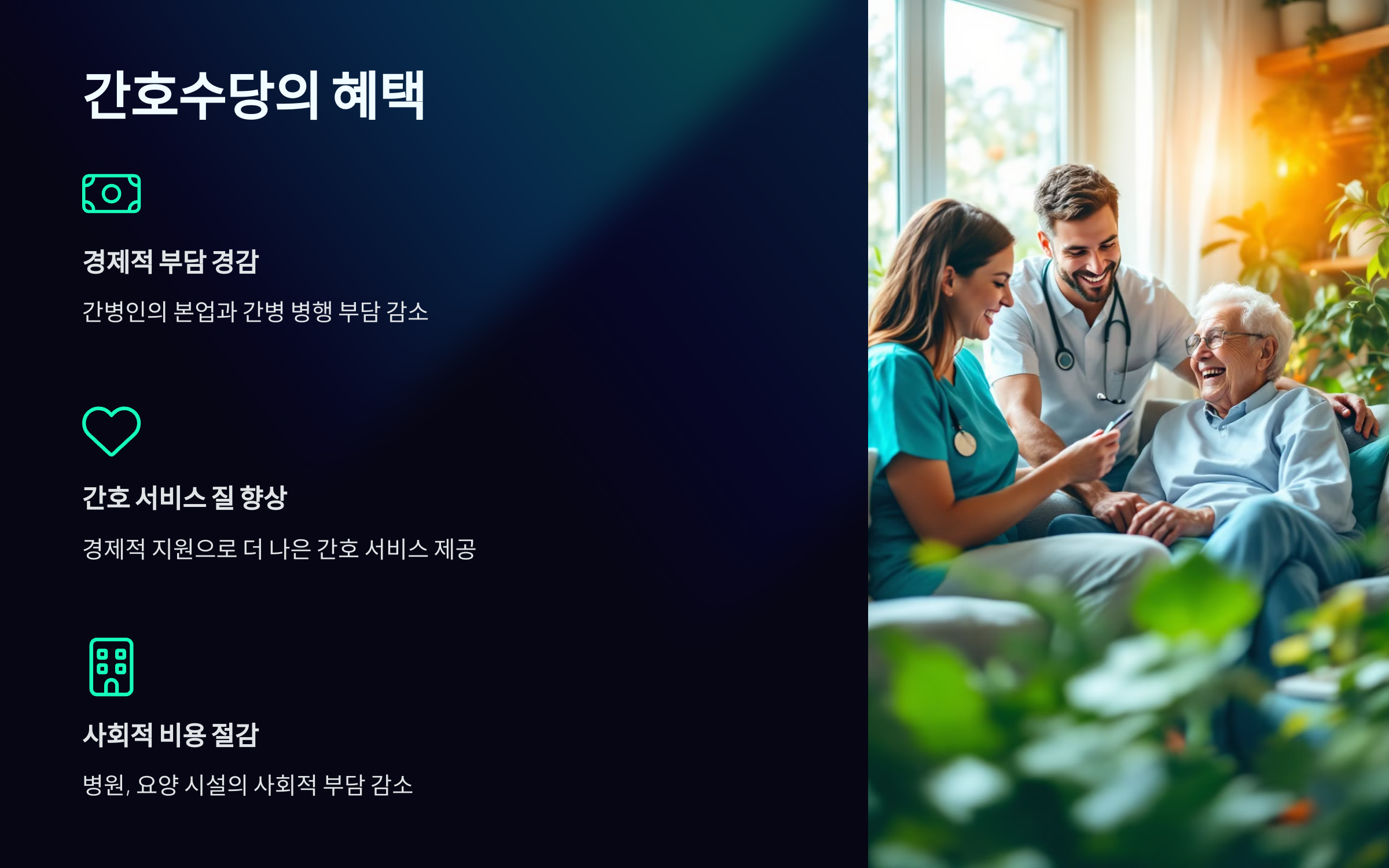 간호수당은 간병을 전담하는 가족들이 경제적 어려움에서 벗어나 환자에게 더욱 집중할 수 있는 환경을 만들어 줍니다. 주된 혜택은 다음과 같습니다: