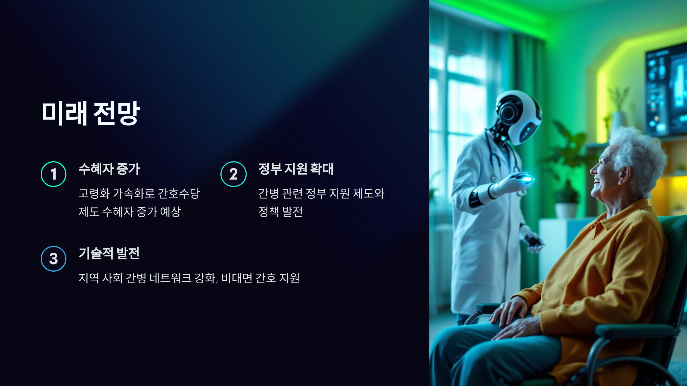 - 사회적 비용 절감: 가정 내 간호가 활성화되면서 병원 또는 요양 시설의 사회적 부담이 감소합니다.