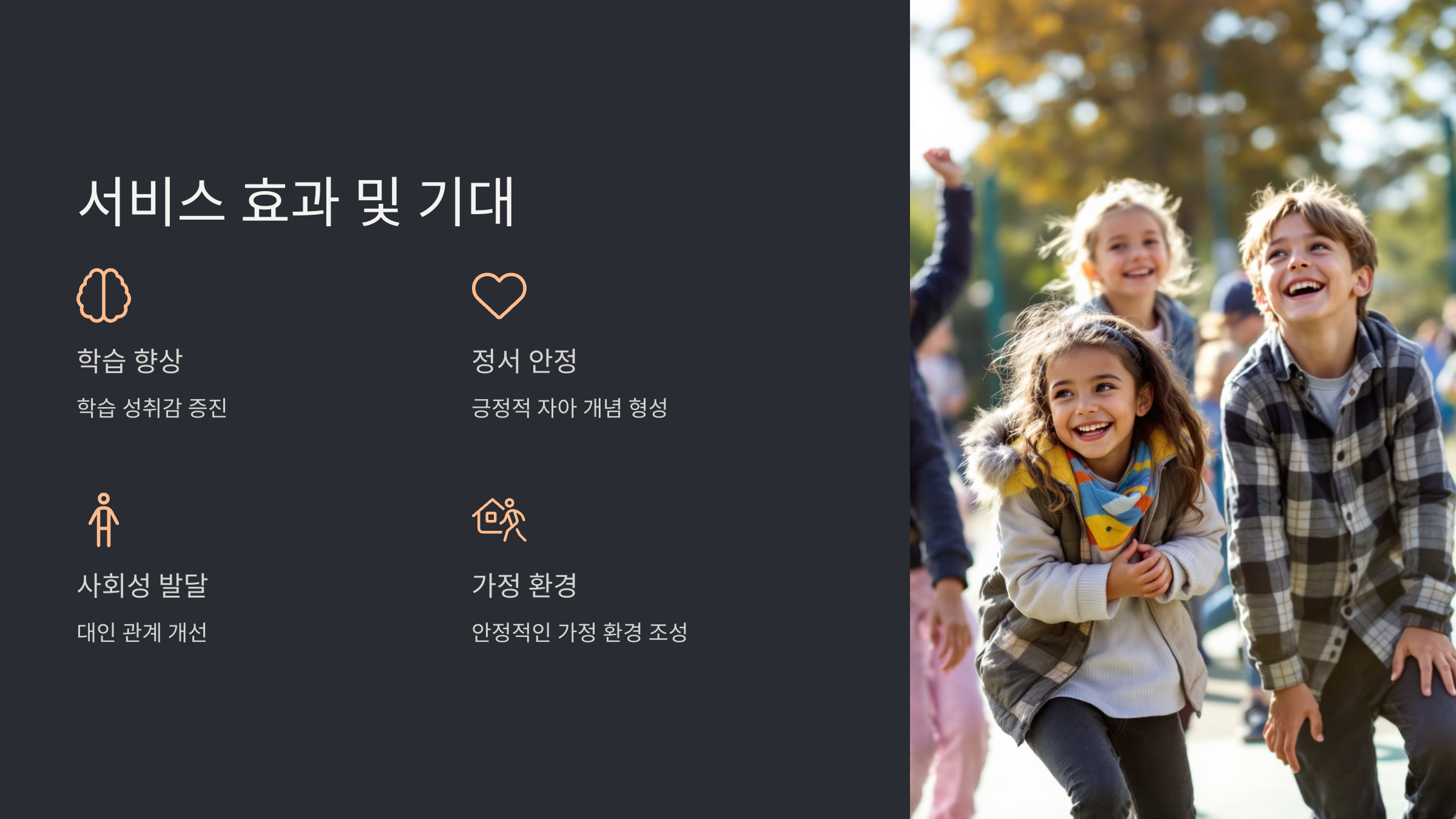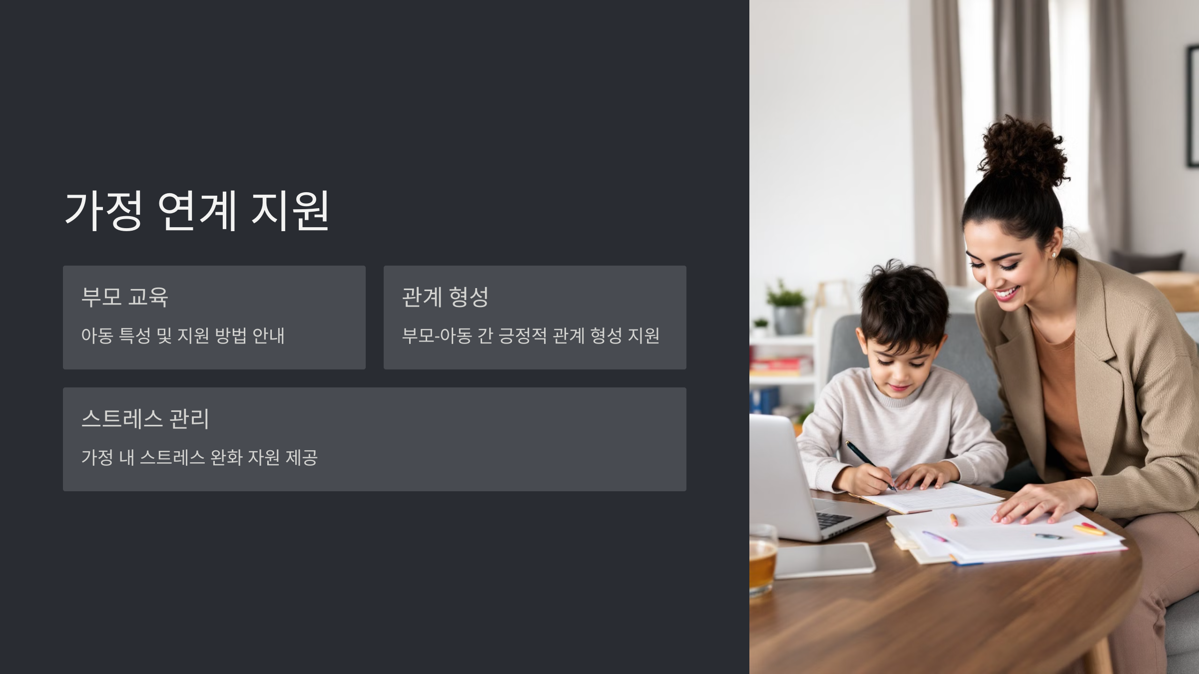 또한, 부모와 보호자도 아동의 상태를 이해하고 적절한 지원 방법을 익히게 되어 가정 내에서의 관계가 개선되고, 안정적인 환경이 조성됩니다. 이러한 서비스는 아동의 건강한 성장과 발달을 지원하는 기반을 마련하며, 이들이 사회에서 당당하고 자신감 있게 생활할 수 있도록 돕습니다.