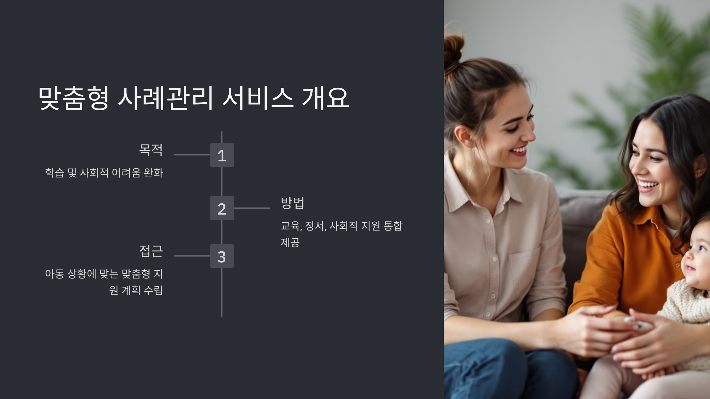 맞춤형 사례관리 서비스는 주기적으로 아동의 상태를 모니터링하고, 추가적인 도움이 필요할 경우 다른 자원과의 연계를 통해 적절한 지원을 이어갑니다. 이러한 모니터링은 아동의 발전 상황을 확인하고 필요에 따라 서비스를 조정할 수 있도록 하여 아동이 최적의 지원을 받을 수 있게 합니다.