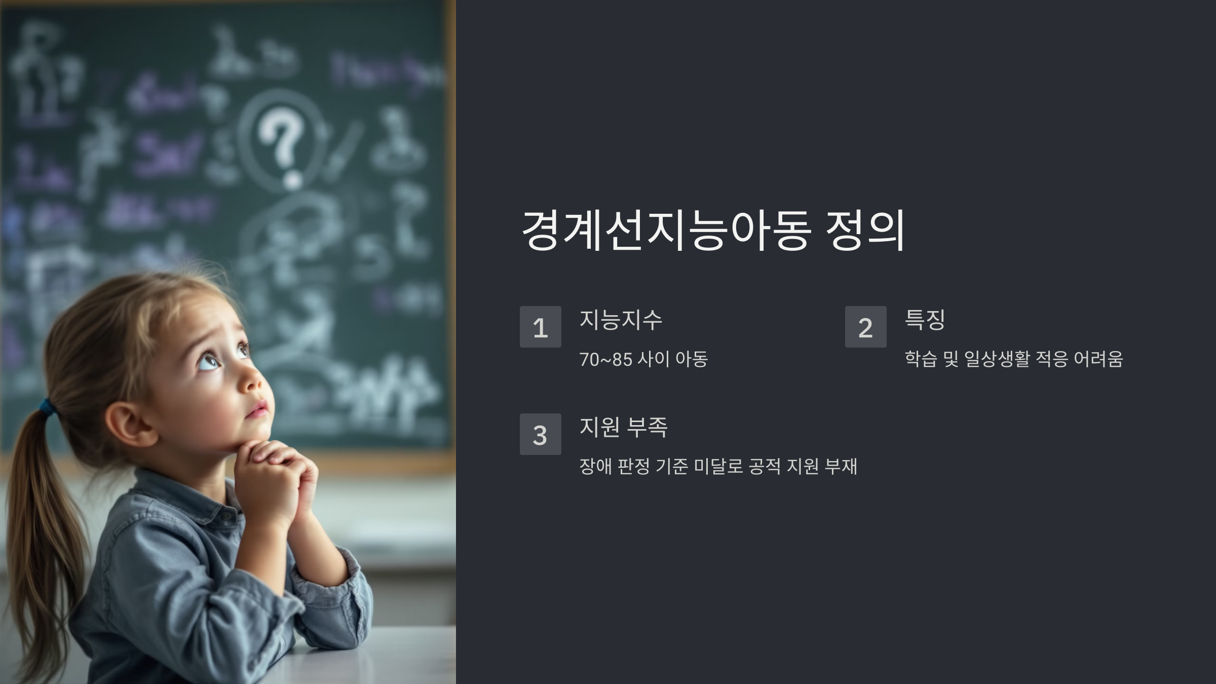 경계선지능아동은 지능지수가 70~85 사이에 속하는 아동으로, 일반 아동과 비교했을 때 학습이나 일상생활 적응에 어려움을 겪을 수 있습니다. 그러나 장애 판정 기준에 미치지 않아 장애 아동으로 등록되지 않으며, 이로 인해 별다른 공적 지원을 받지 못하는 경우가 많습니다. 이러한 아동들은 학습 능력이 낮고 사회적 상황을 이해하는 데 어려움을 겪기 쉬우며, 자존감 저하, 학습 부진, 사회적 소외와 같은 문제를 경험하기도 합니다. 따라서 경계선지능아동에게는 이들의 특성과 필요에 맞춘 맞춤형 지원이 절실합니다.