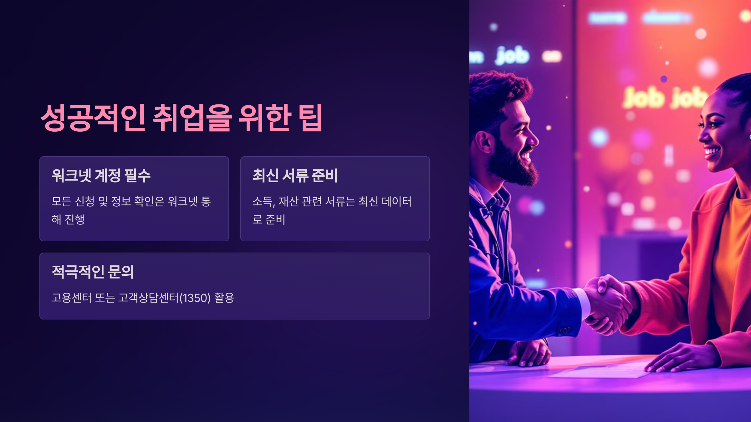 - 문의 적극 활용: 고용센터 또는 고객상담센터(국번 없이 1350)를 통해 궁금한 점을 확인하세요.