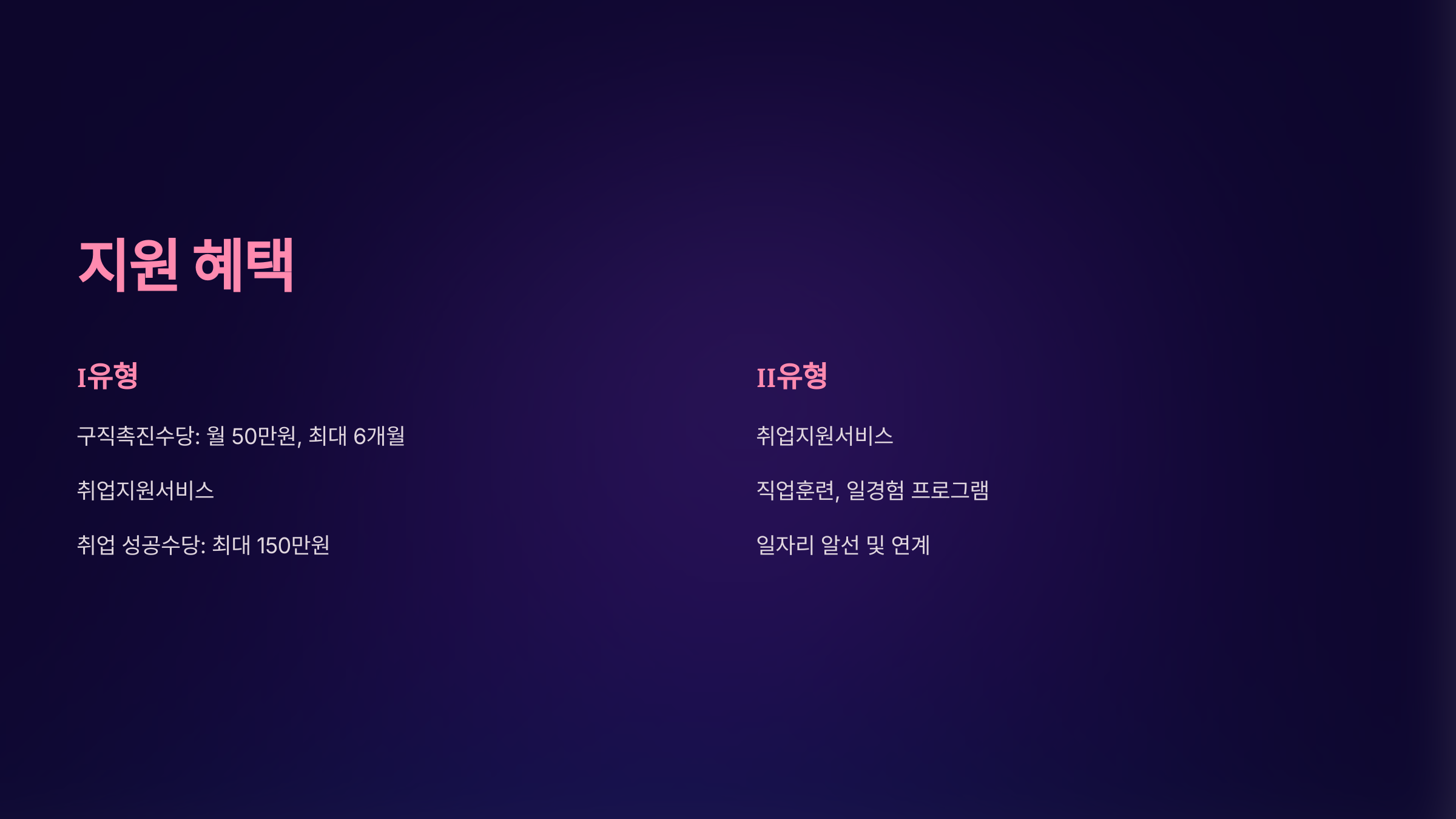 - I유형은 생계 유지와 취업 지원을 동시에 받을 수 있는 반면, II유형은 소득 지원 없이 취업 서비스만 제공됩니다.