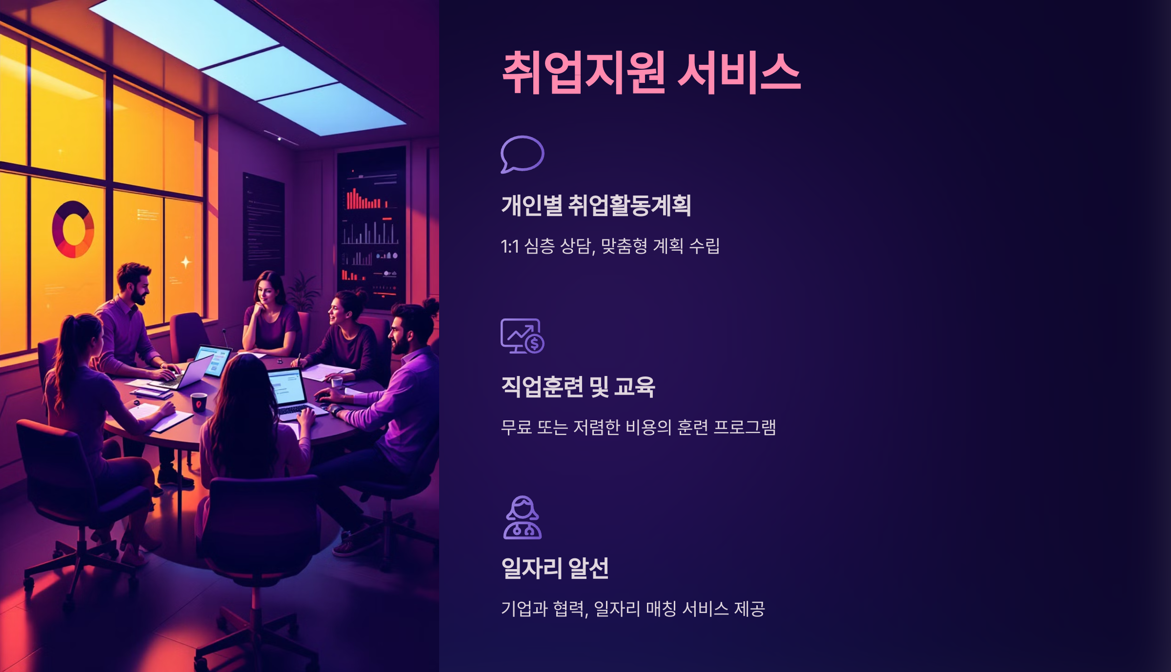 - 취업 성공 후에도 고용 유지 및 직장 적응을 돕는 사후관리 서비스를 받을 수 있습니다.