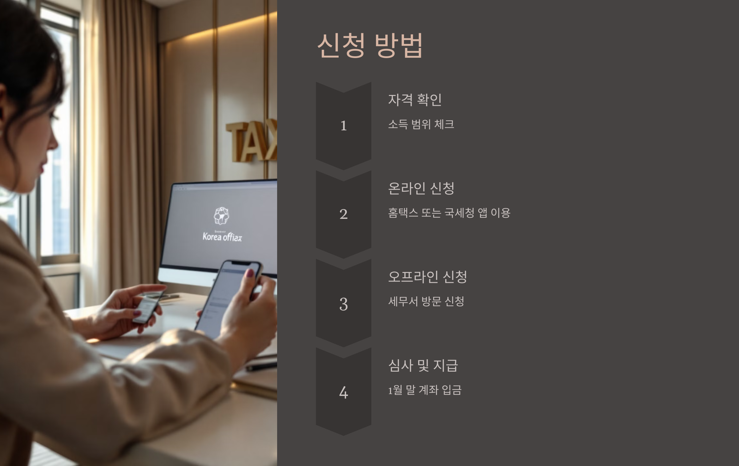 - 신청서를 제출하면 국세청에서 이를 심사합니다. 심사 결과, 지원 대상에 해당하면 지원금이 지급됩니다.