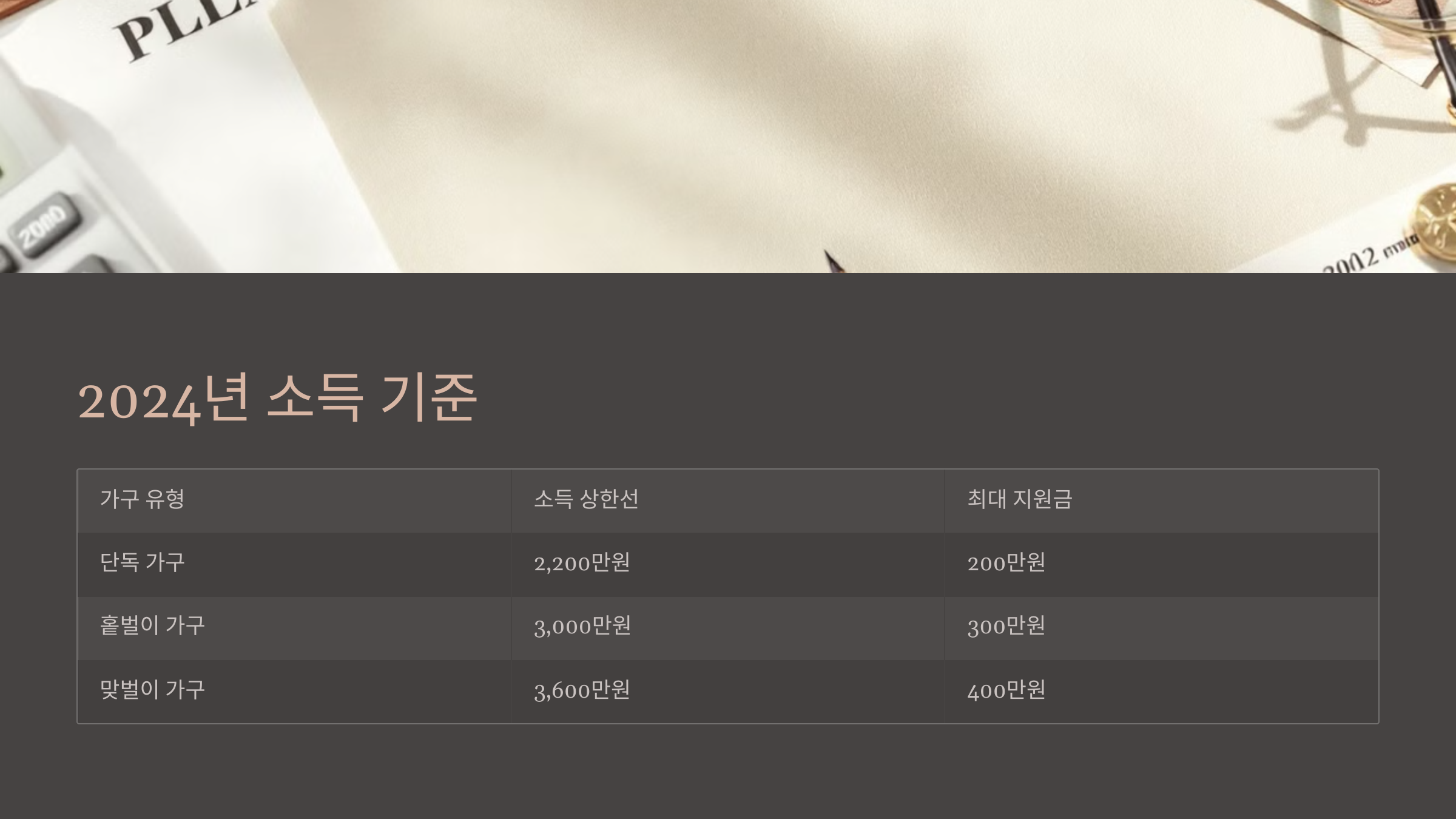 | 홑벌이 가구 (배우자 없는 가구) | 2,300만원 이하 | 3,000만원 이하 | 최대 300만원 |
