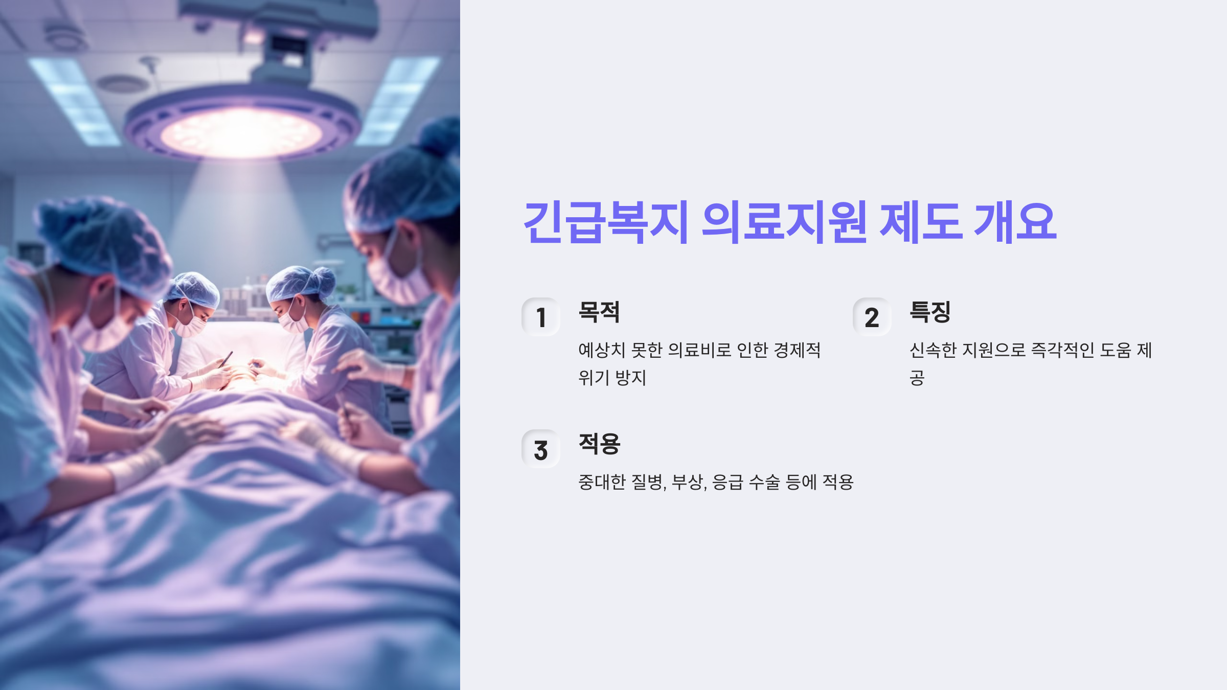 - 신속한 지원: 갑작스러운 의료비 부담을 신속하게 지원하여 경제적 위기가 가중되지 않도록 합니다.