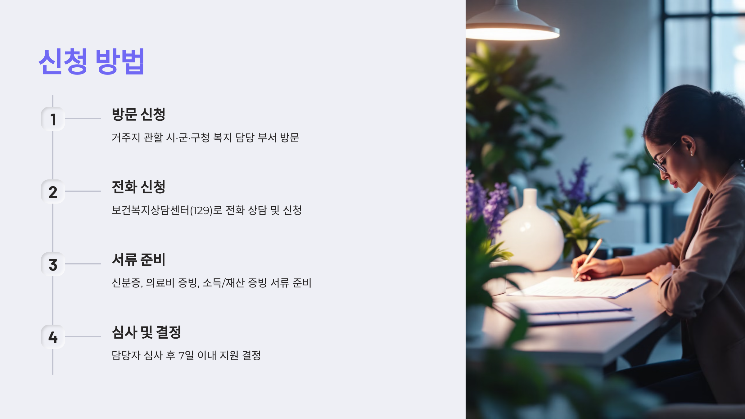 - 신청 방법: 시·군·구청 방문 또는 보건복지상담센터(129) 상담