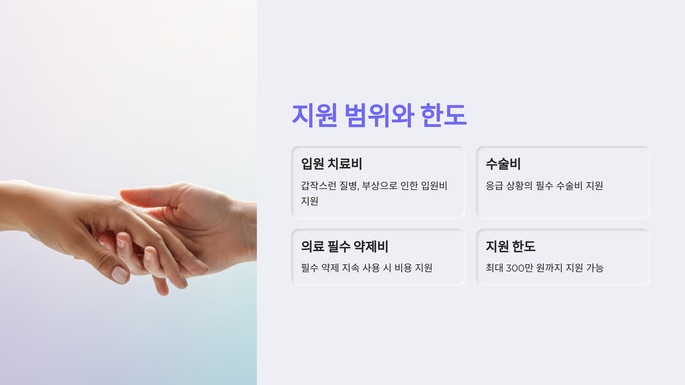 - 지원 항목: 입원비, 수술비, 필수 약제비