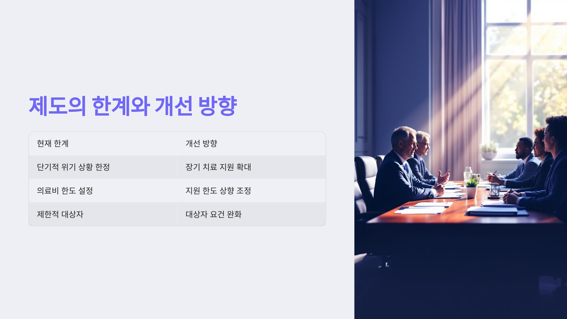 - 개선점: 장기 치료 지원 부족, 의료비 한도 확대 필요성