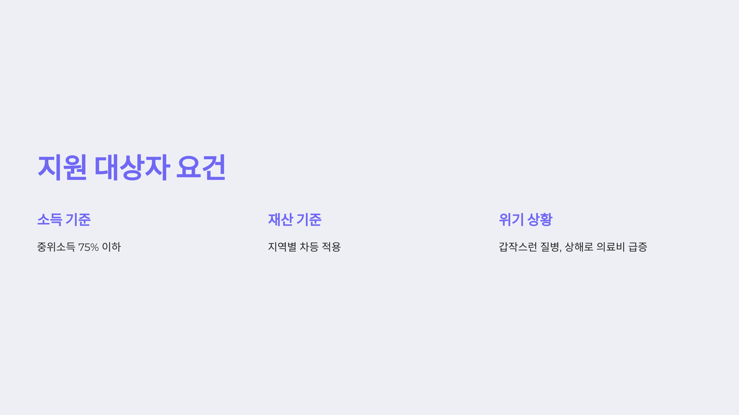 - 지원 대상: 중위소득 75% 이하의 소득 기준과 재산 기준을 충족하는 가구