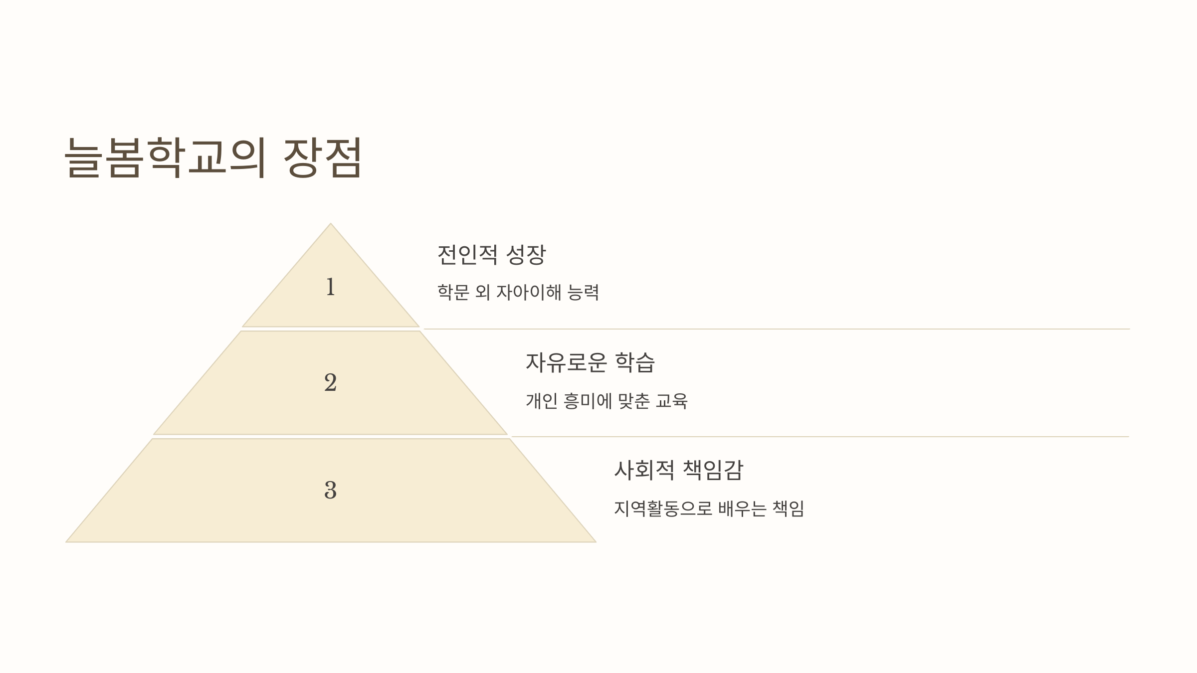 - 자유로운 학습 환경: 각 학생의 흥미와 필요에 맞춰 학습의 자유도가 높습니다.