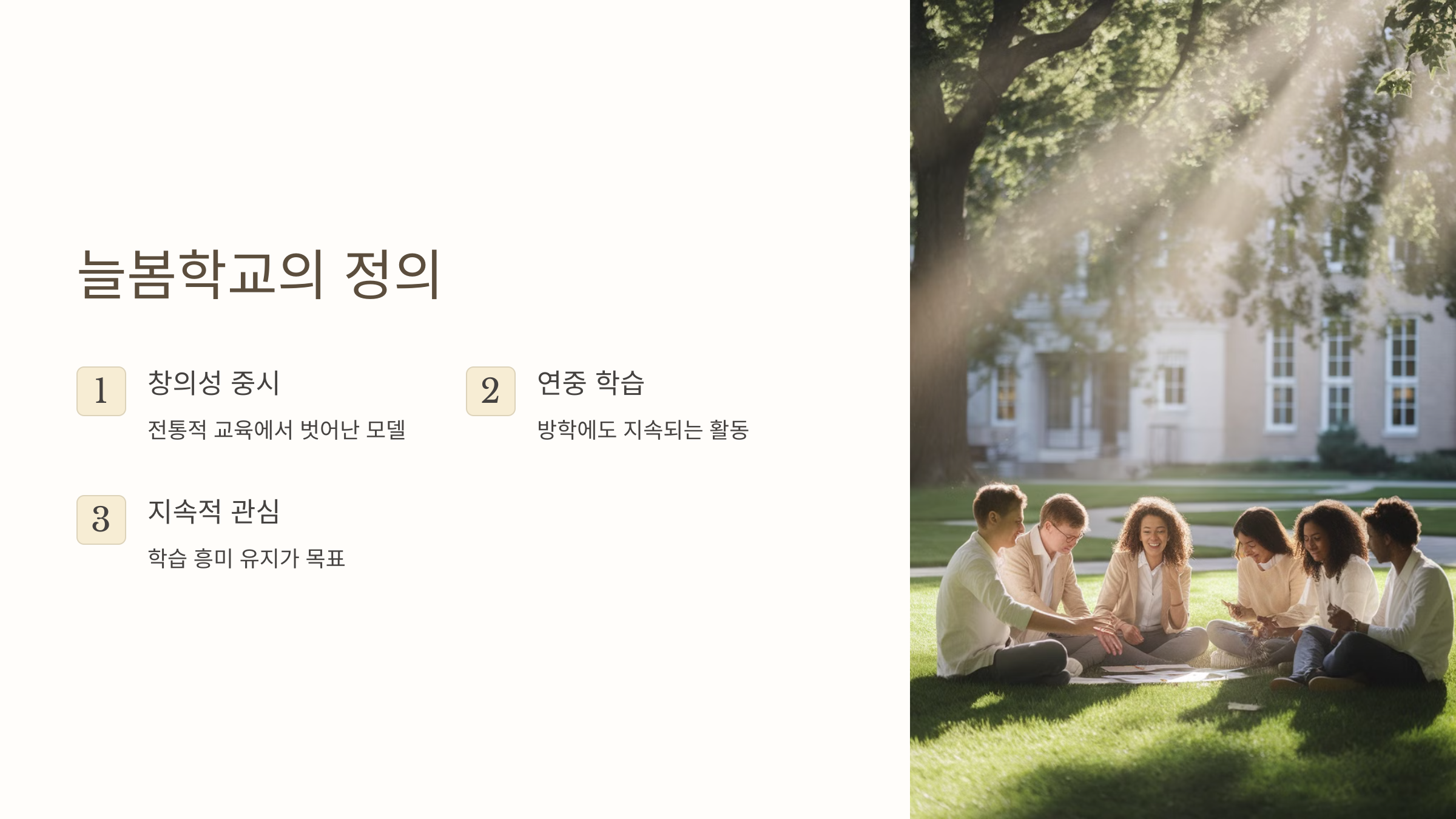 늘봄학교는 전통적인 학교 교육 방식에서 벗어나, 학생들의 창의성과 자기주도적인 학습을 중시하는 교육 모델입니다. 이 학교는 일반적으로 학교에 다니지 않는 시간이나 방학 동안에도 학습과 다양한 활동이 지속적으로 이루어집니다. 그 목적은 학생들이 학습에 대해 지속적인 관심을 가질 수 있도록 도와주는 것입니다.