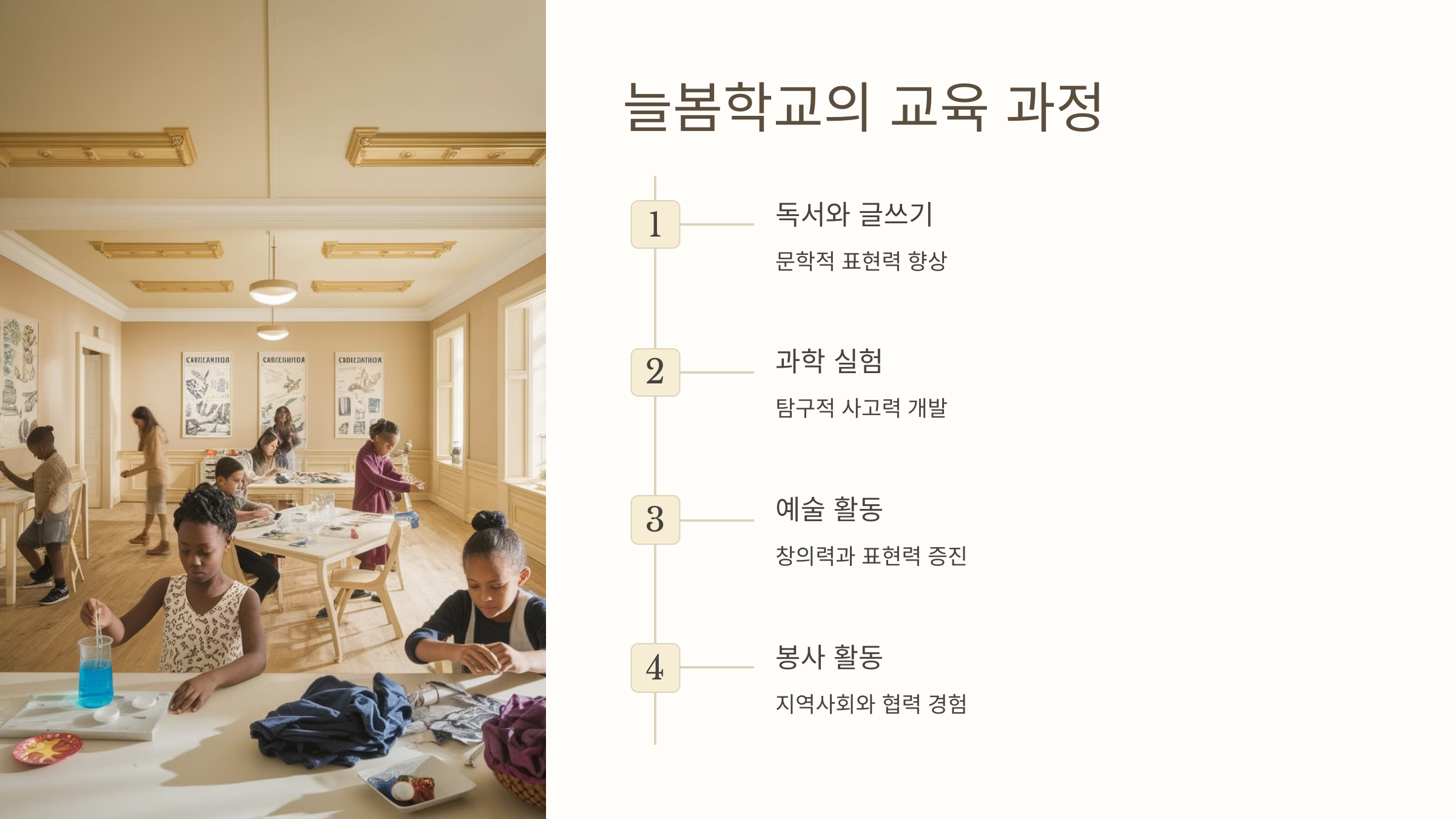 늘봄학교의 교육 과정은 전통적인 학과 수업 외에도 다양한 창의적이고 실용적인 활동을 포함합니다. 예를 들어, 독서와 글쓰기, 과학 실험, 다양한 예술 활동 등이 학생들의 상상력과 창의력을 키우는 데 큰 역할을 합니다. 또한, 지역 사회와 협력하여 봉사 활동이나 체험학습도 포함되어 있습니다.