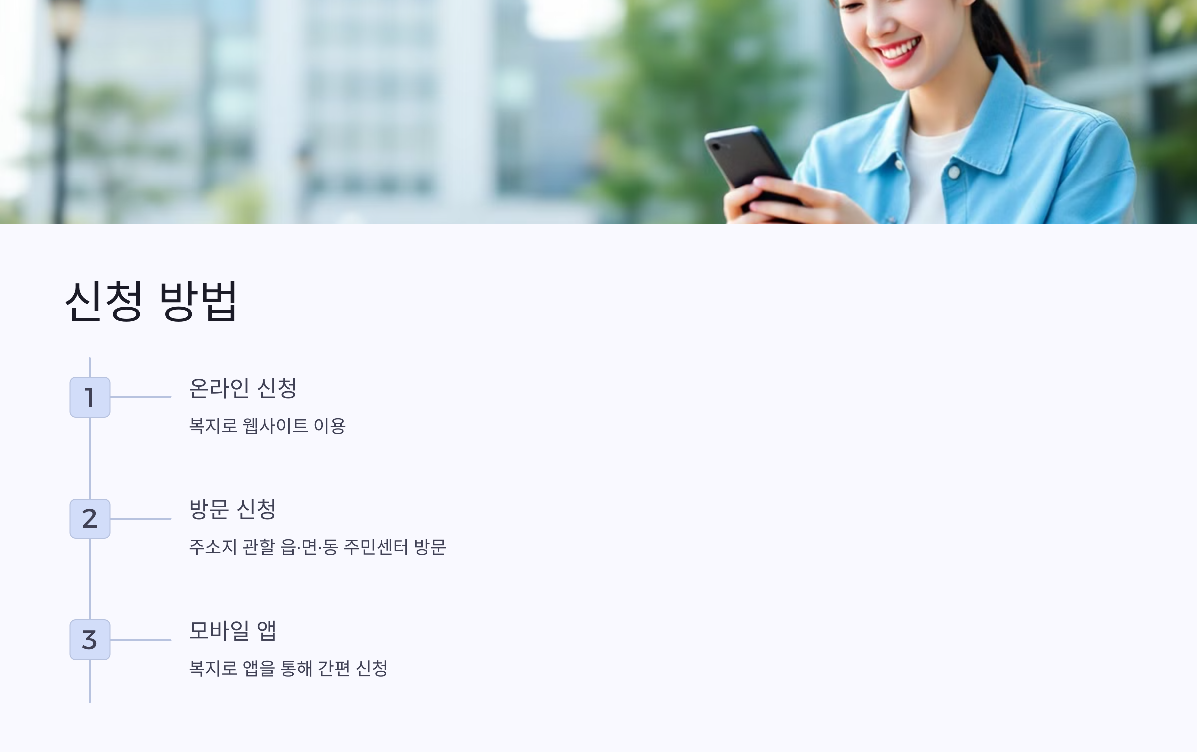 - 복지로에서 온라인 신청하거나 주민센터 방문.