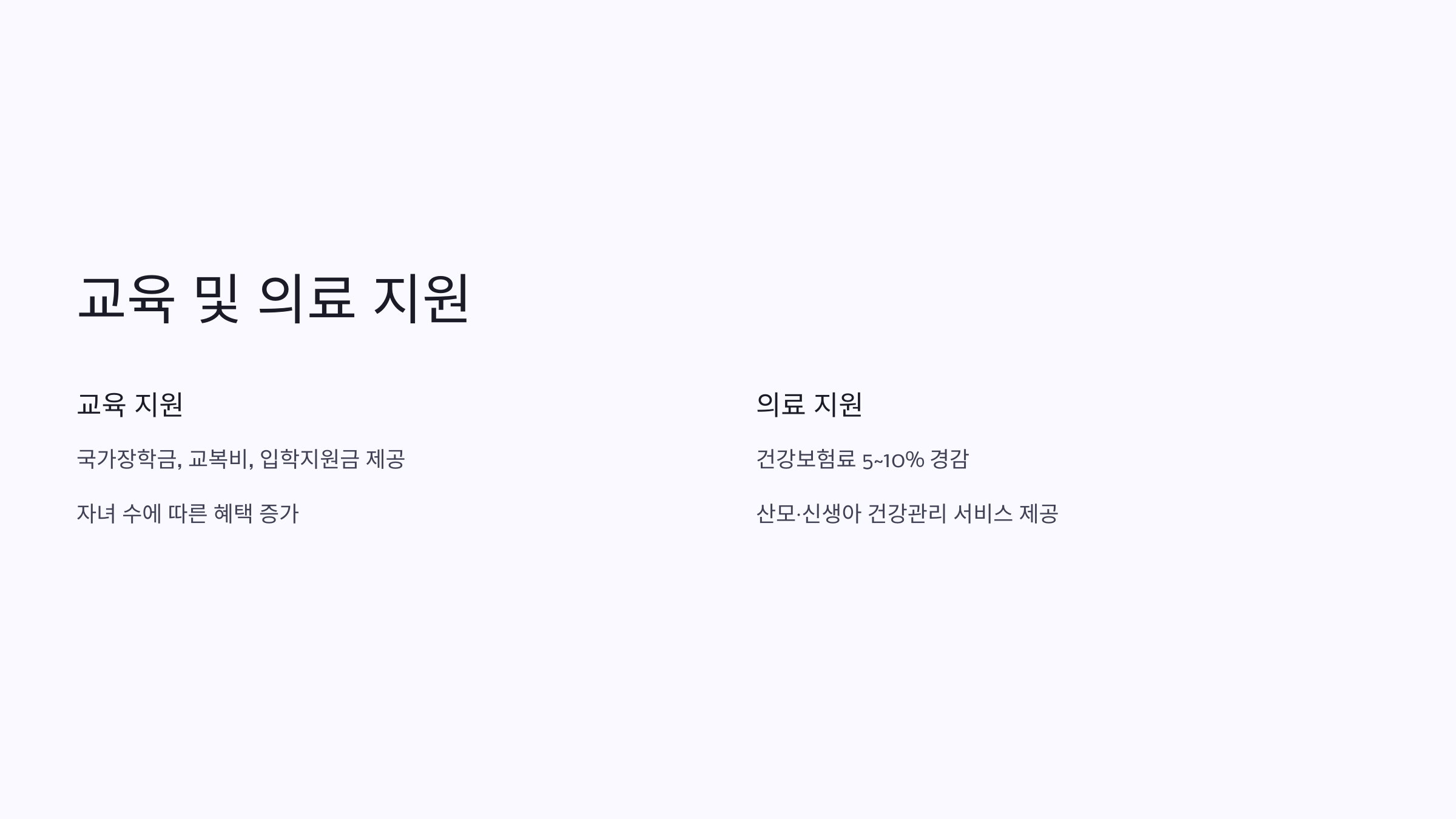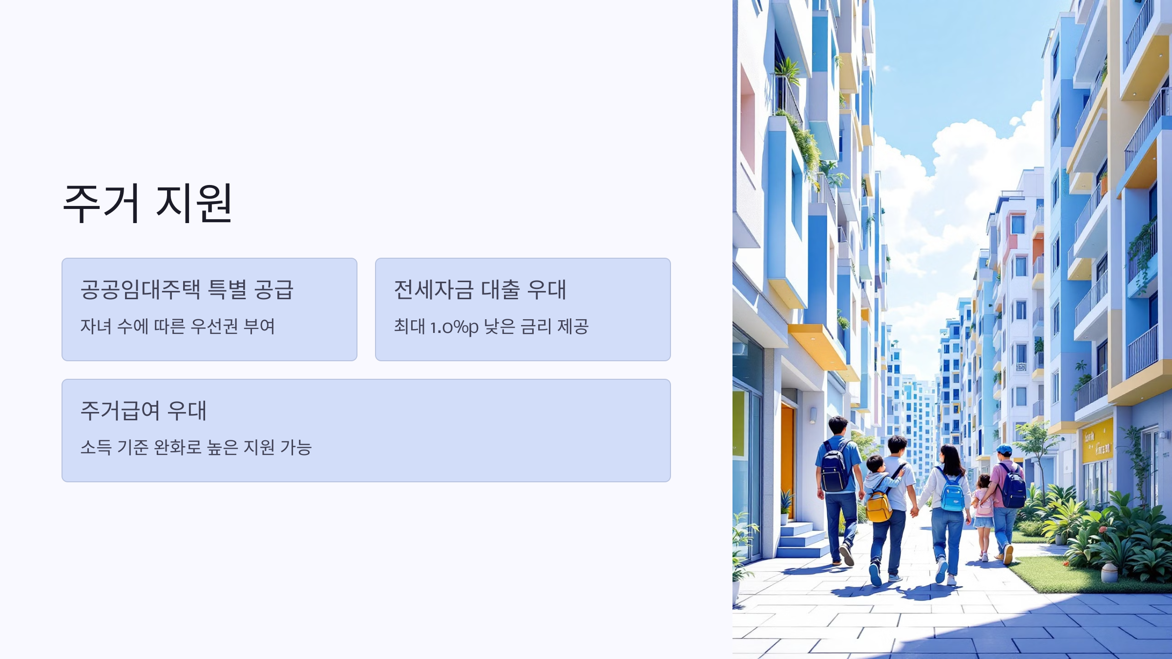- 일부 지원은 자녀 수, 소득 수준, 거주 지역에 따라 우선순위가 달라짐.