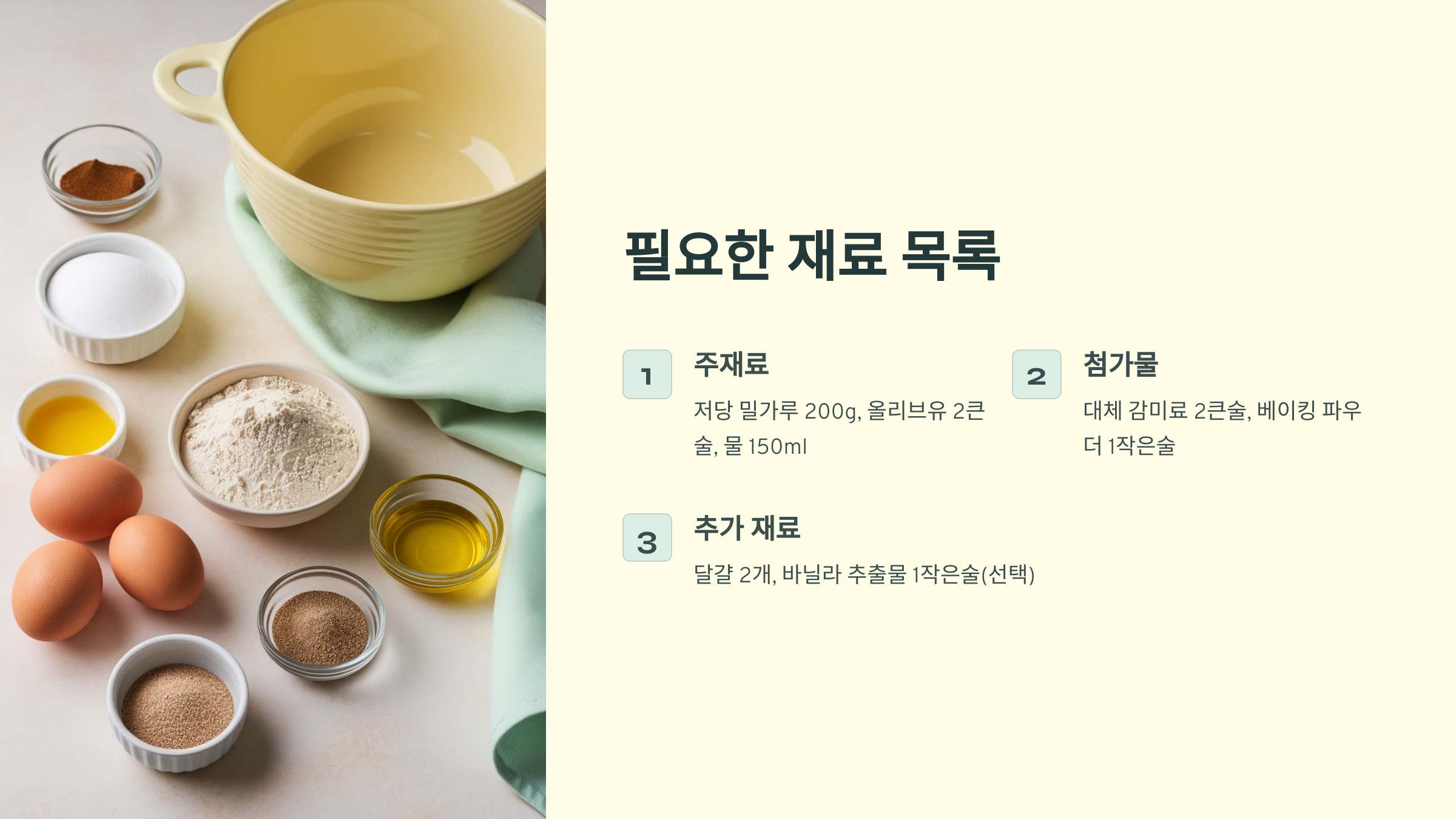 | 4 | 베이킹 파우더 | 1작은술 | 반죽이 부풀도록 돕는 역할을 합니다. |