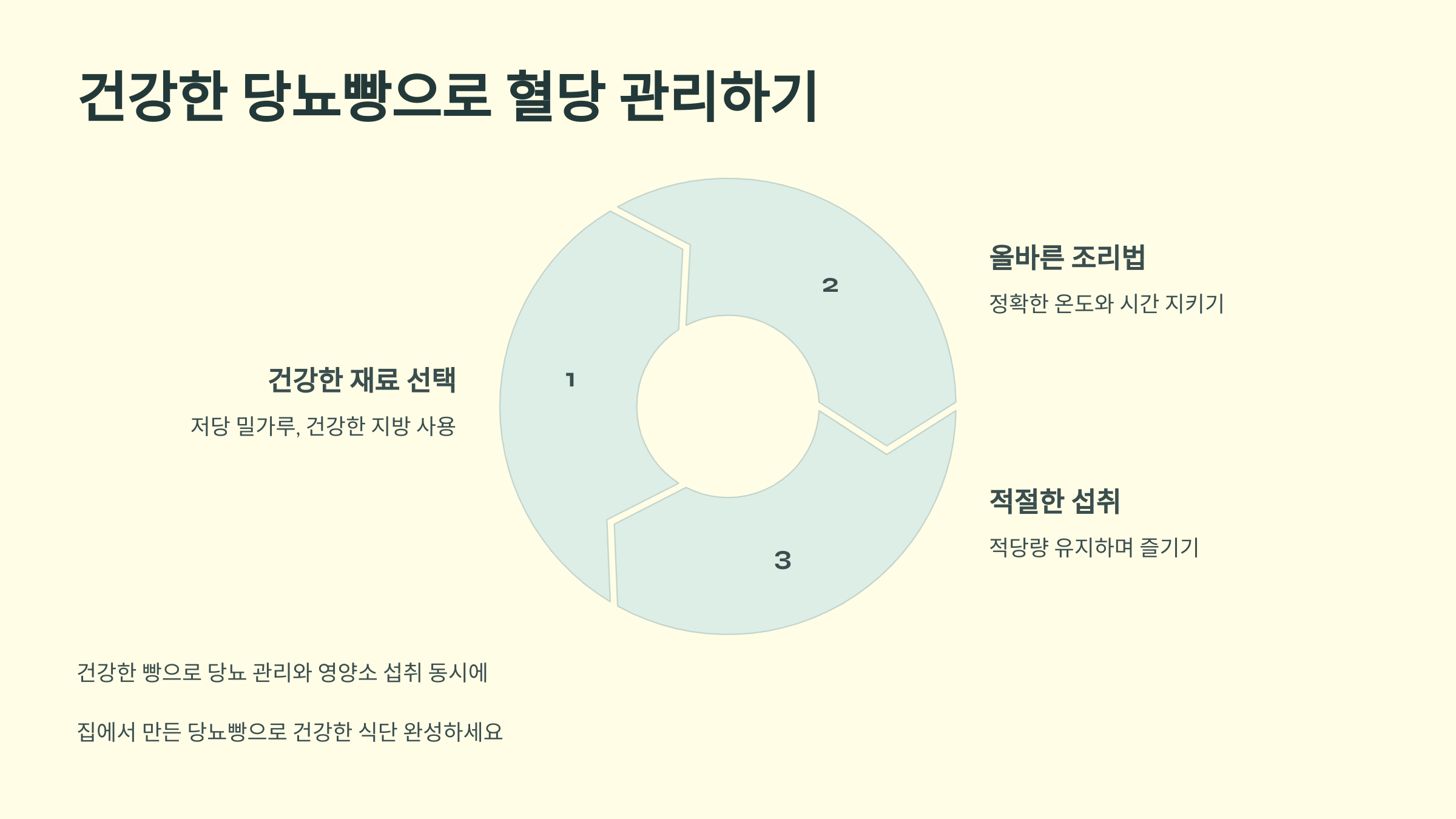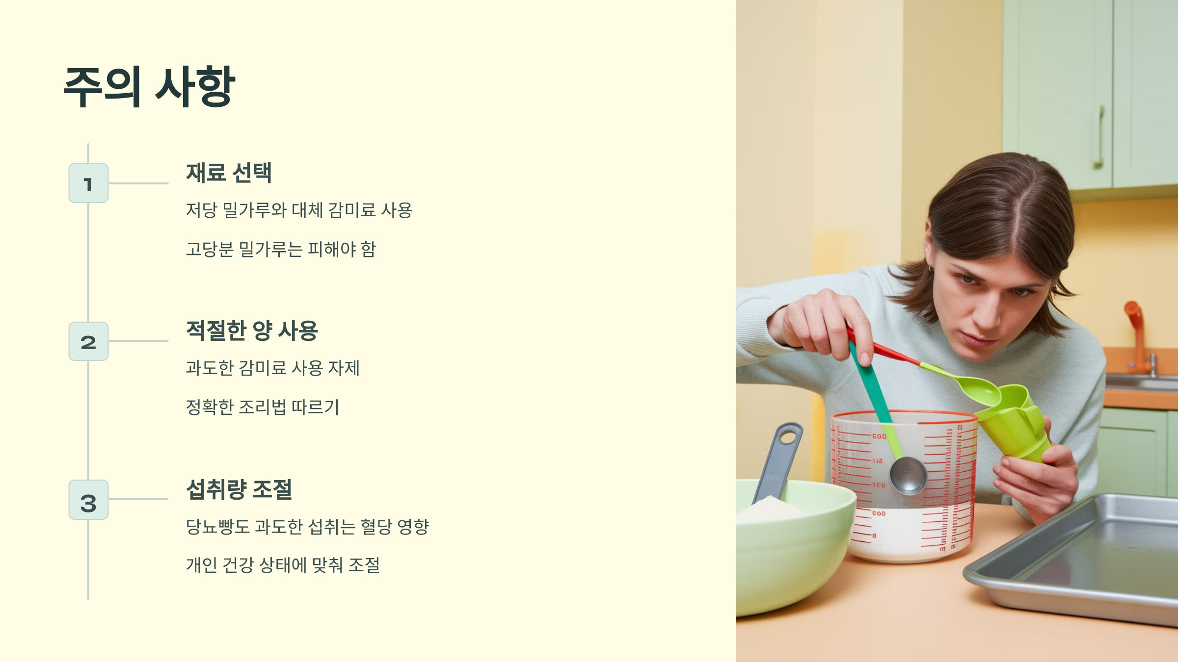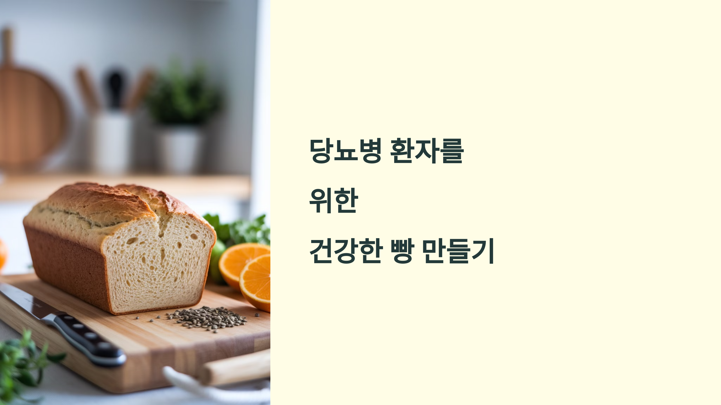 당뇨빵을 만들 때는 저당 밀가루와 대체 감미료를 사용하되, 반드시 당뇨에 적합한 재료인지 확인하세요. 예를 들어, 아몬드 밀가루나 귀리 밀가루는 당뇨 환자에게 좋지만, 일부 고당분 밀가루는 피해야 합니다. - 과도한 감미료 사용 자제