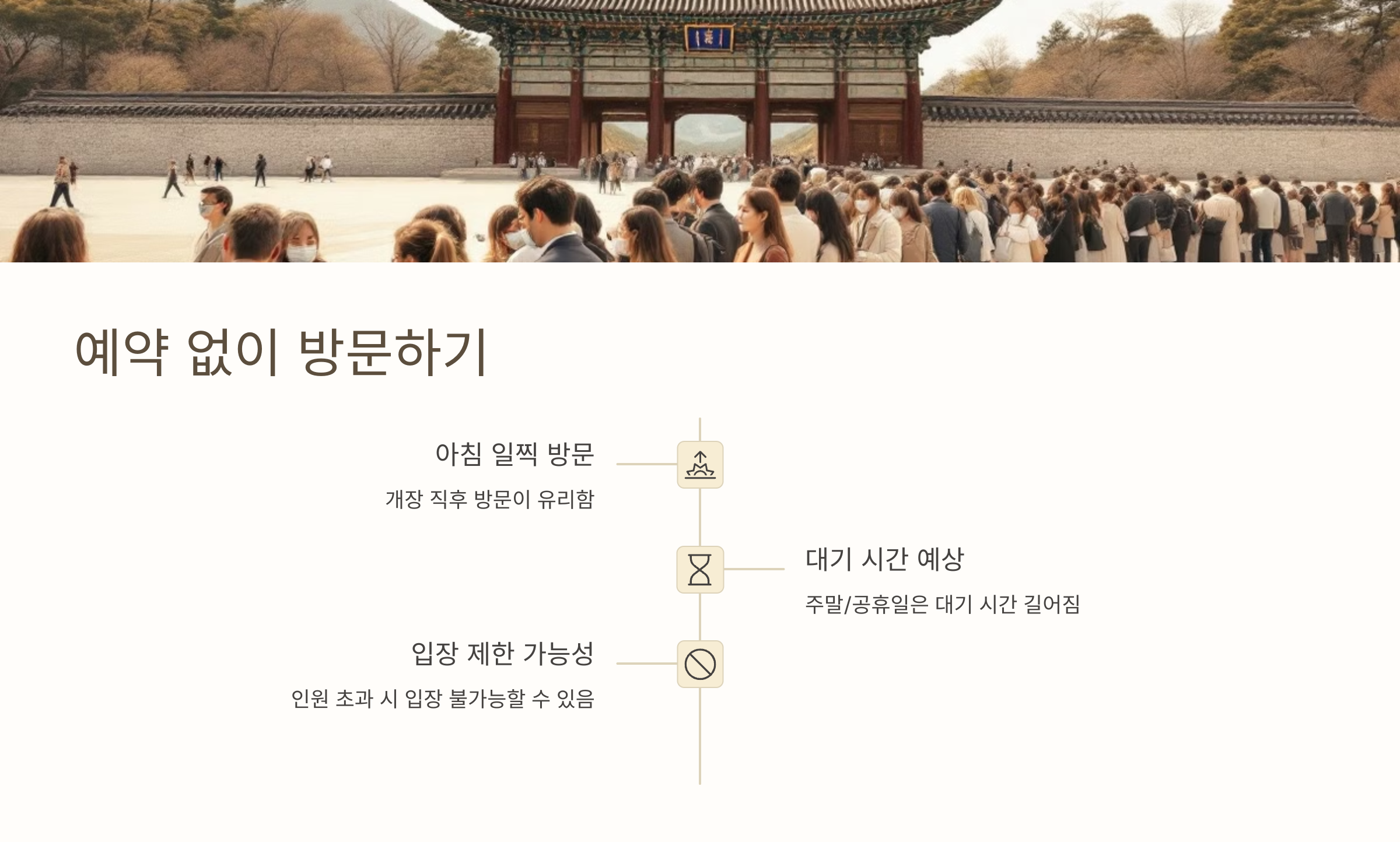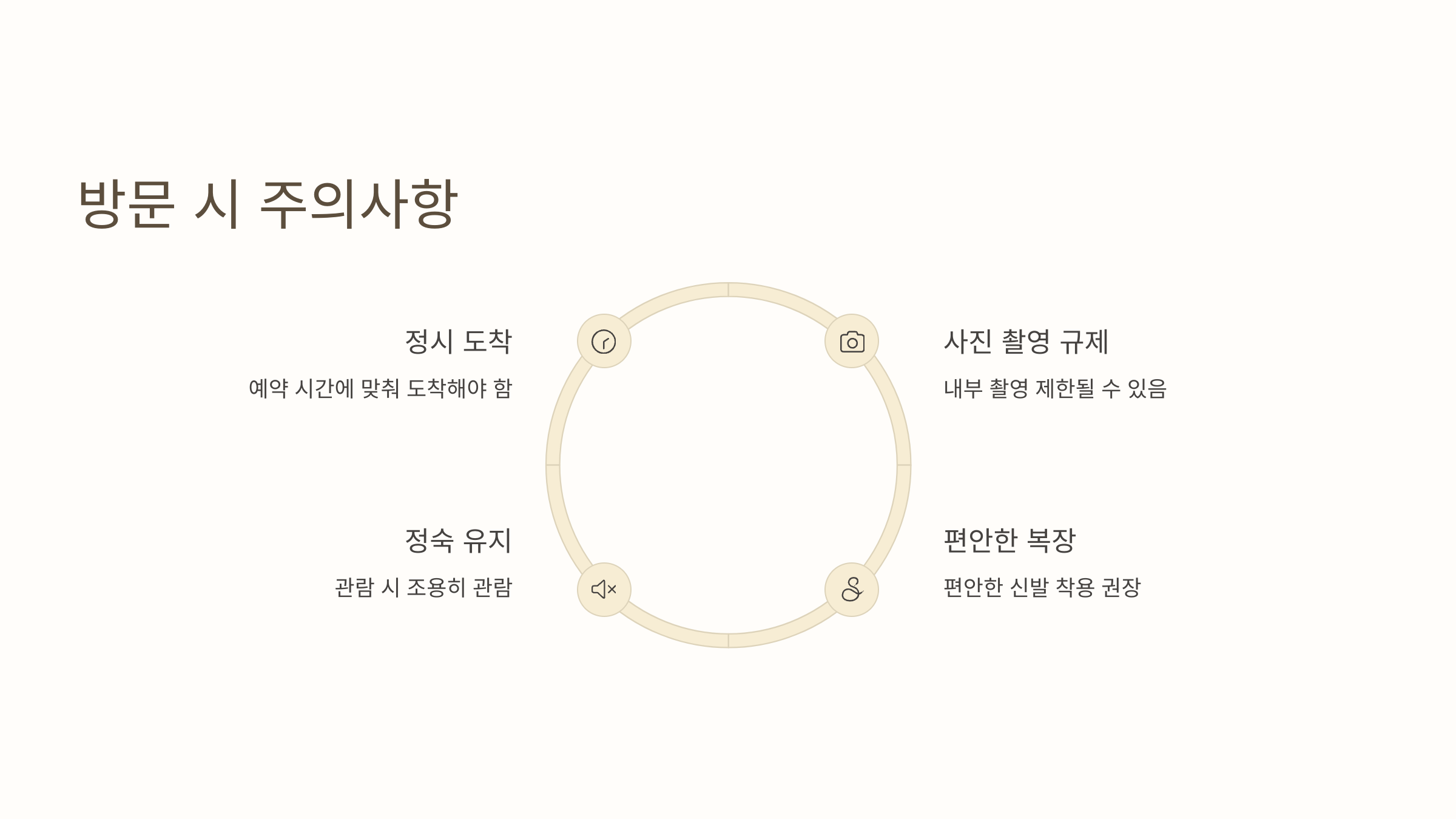 - 정해진 시간에 도착: 예약 시간에 맞춰 도착해야 하며, 늦으면 입장이 불가능할 수 있습니다.
