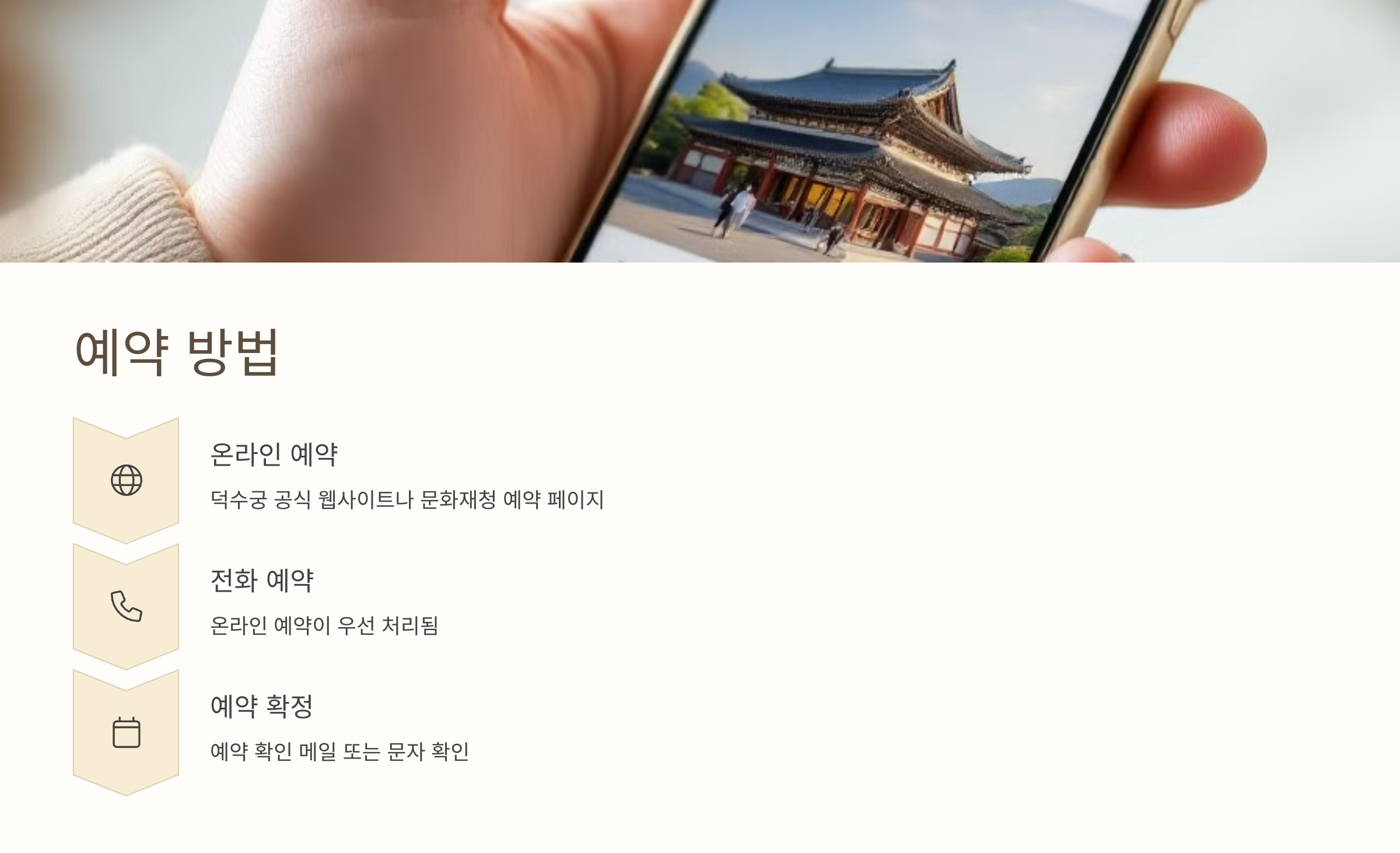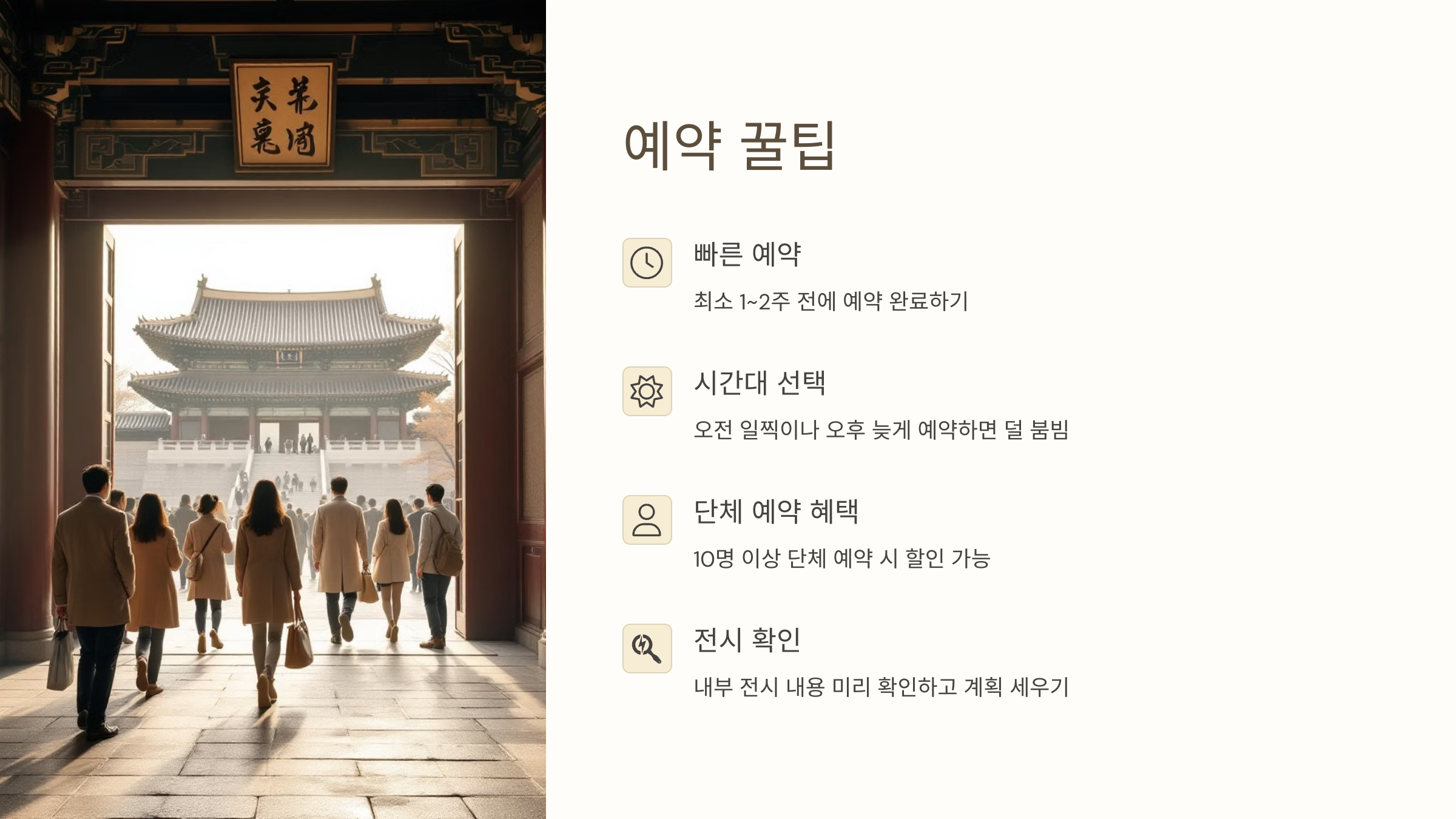 - 온라인 예약: 덕수궁 공식 웹사이트나 문화재청의 예약 페이지를 통해 쉽게 예약할 수 있습니다.