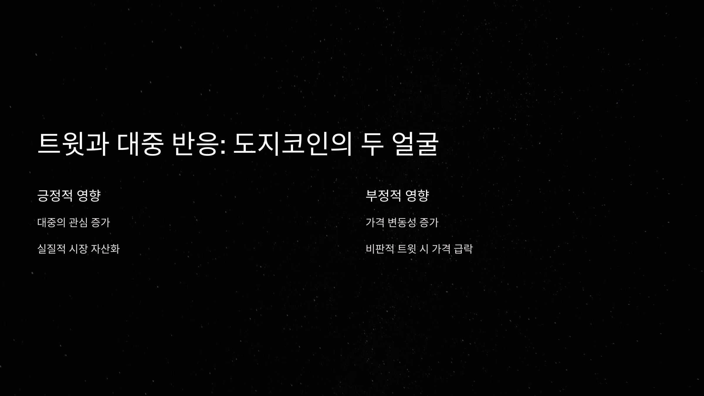 엘론 머스크의 트윗은 도지코인에 대한 대중의 관심을 끌어들이는 중요한 요소였지만, 그로 인해 도지코인의 가격 변동성이 커졌다는 단점도 있었습니다. 때때로 머스크의 트윗은 도지코인의 가격을 급격히 떨어뜨리기도 했습니다. 예를 들어, 머스크가 도지코인에 대해 "게임처럼" 표현하거나 비판적인 트윗을 할 때, 가격은 급락했습니다.
