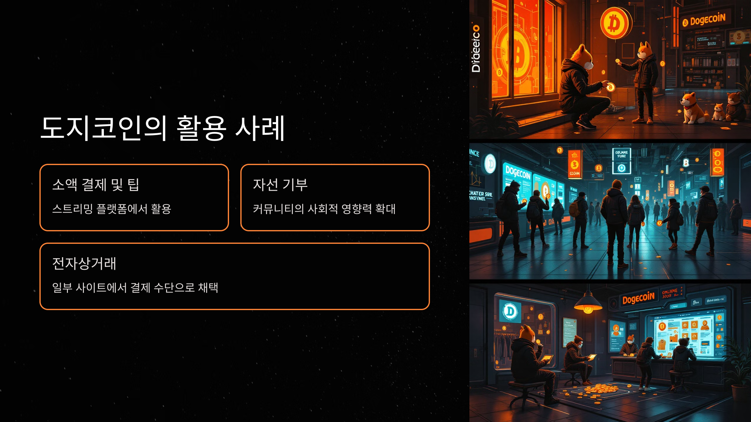 - 소액 결제 및 팁: 도지코인은 빠른 거래 처리 속도와 낮은 수수료 덕분에 소액 결제와 팁을 주는 데 많이 사용됩니다. 예를 들어, 스트리밍 플랫폼에서 방송인들이 팬들로부터 팁을 받을 때 도지코인을 자주 사용합니다.