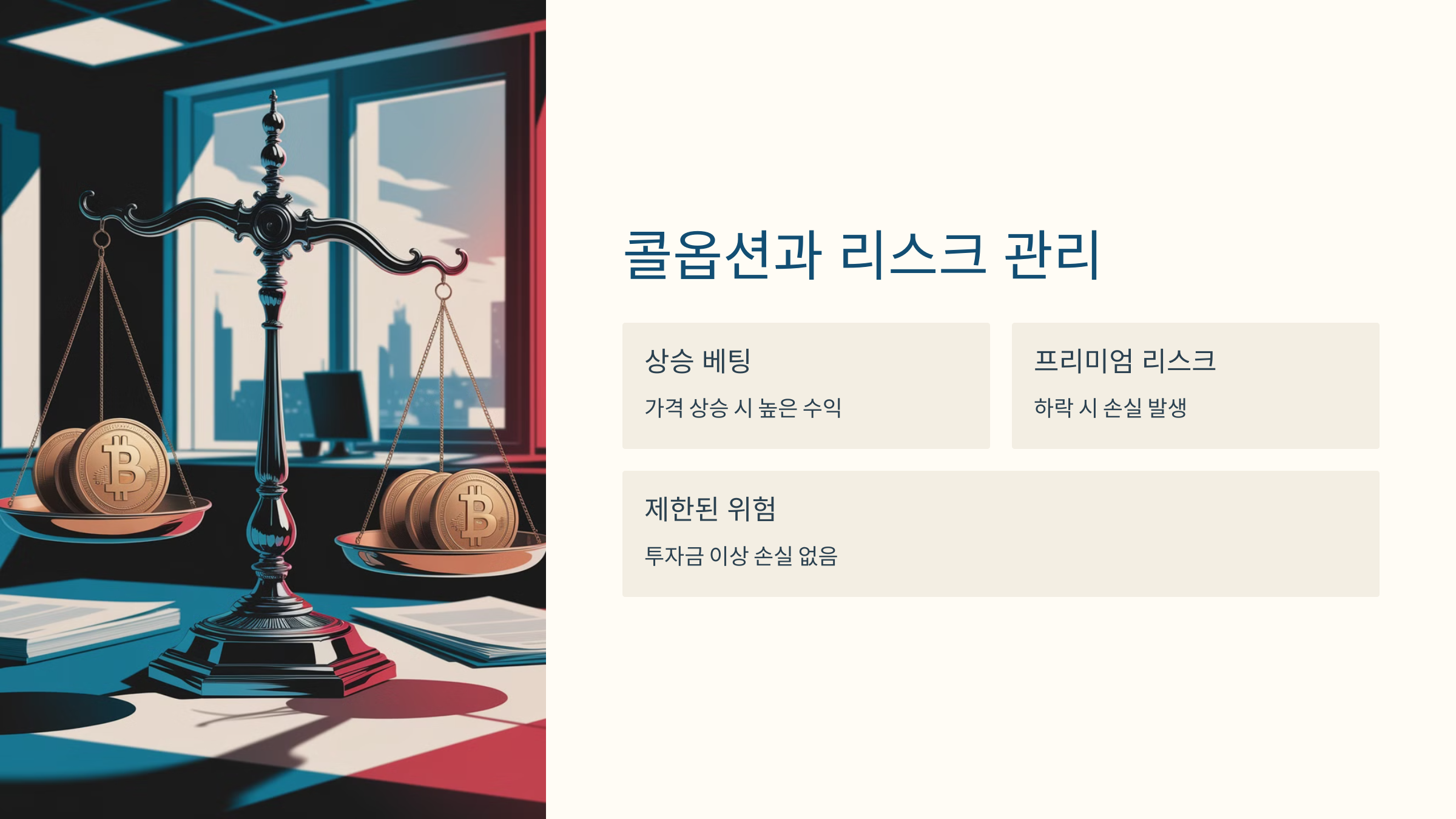 | 3. 콜옵션의 리스크는 무엇인가요? | 콜옵션은 리플 가격 상승 시 높은 수익을 기대하지만, 하락 시 프리미엄을 잃을 위험이 있습니다. |