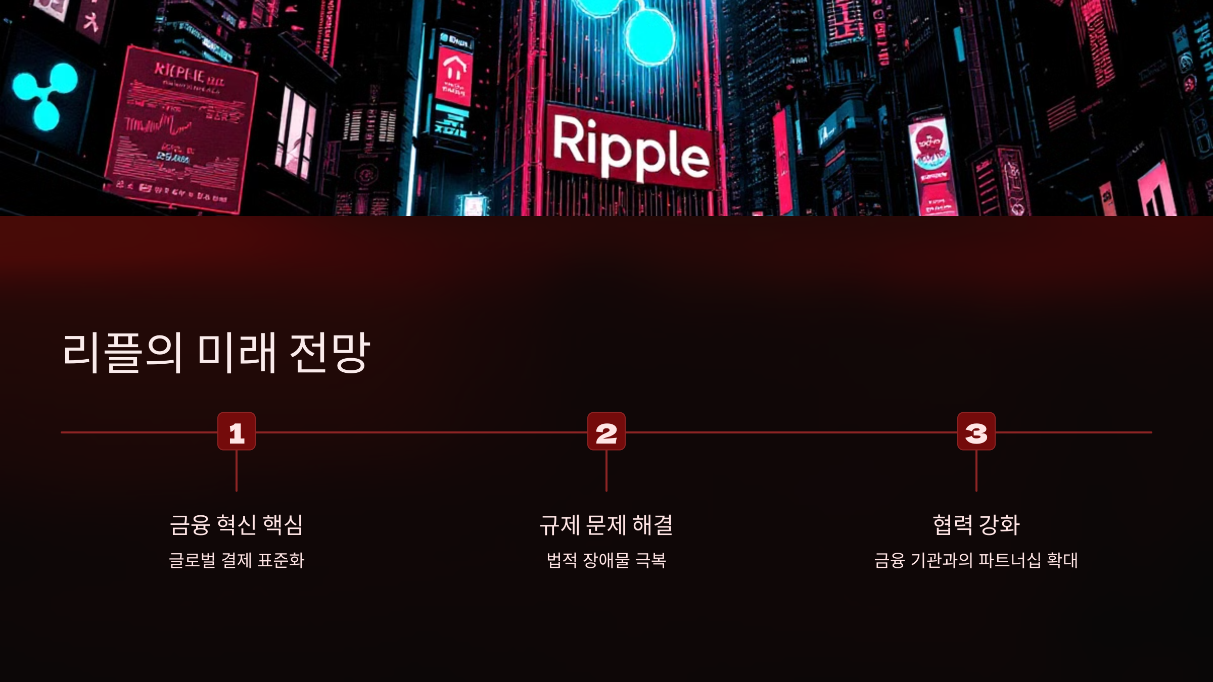 리플은 글로벌 금융 시장에서 중요한 역할을 할 가능성이 높은 프로젝트로 평가받고 있습니다. 특히, 국경 간 송금과 금융 거래의 효율성을 개선하는 데 중점을 두고 있는 리플은 금융 혁신의 핵심으로 자리 잡을 전망입니다. Ripple Labs는 규제 문제를 해결하고 금융 기관과의 협력을 더욱 강화하며, 글로벌 결제 표준으로 자리 잡기 위한 노력을 지속하고 있습니다.