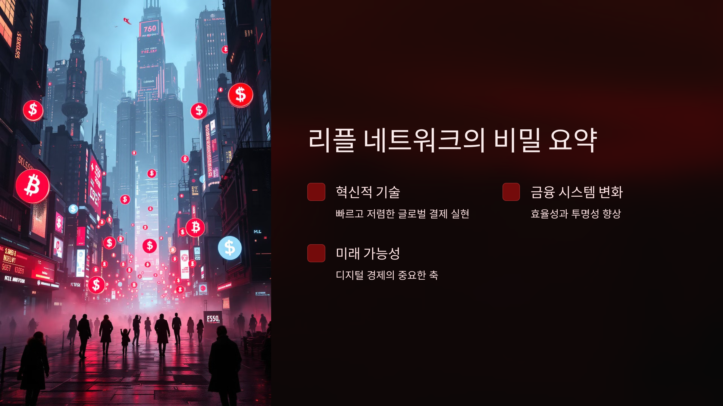 리플 네트워크는 기존 금융 시스템의 비효율성을 극복하며 글로벌 금융 혁신을 선도하고 있습니다. 빠르고 저렴한 결제를 가능하게 하는 리플의 기술은 미래 디지털 경제의 중요한 축으로 자리 잡을 것입니다. 비록 규제와 경쟁과 같은 도전 과제가 있지만, 리플이 만들어가는 글로벌 결제의 새로운 패러다임은 앞으로 더 많은 주목을 받을 것입니다. 지금이 바로 리플 네트워크의 비밀을 이해하고 그 가능성을 탐구할 때입니다.