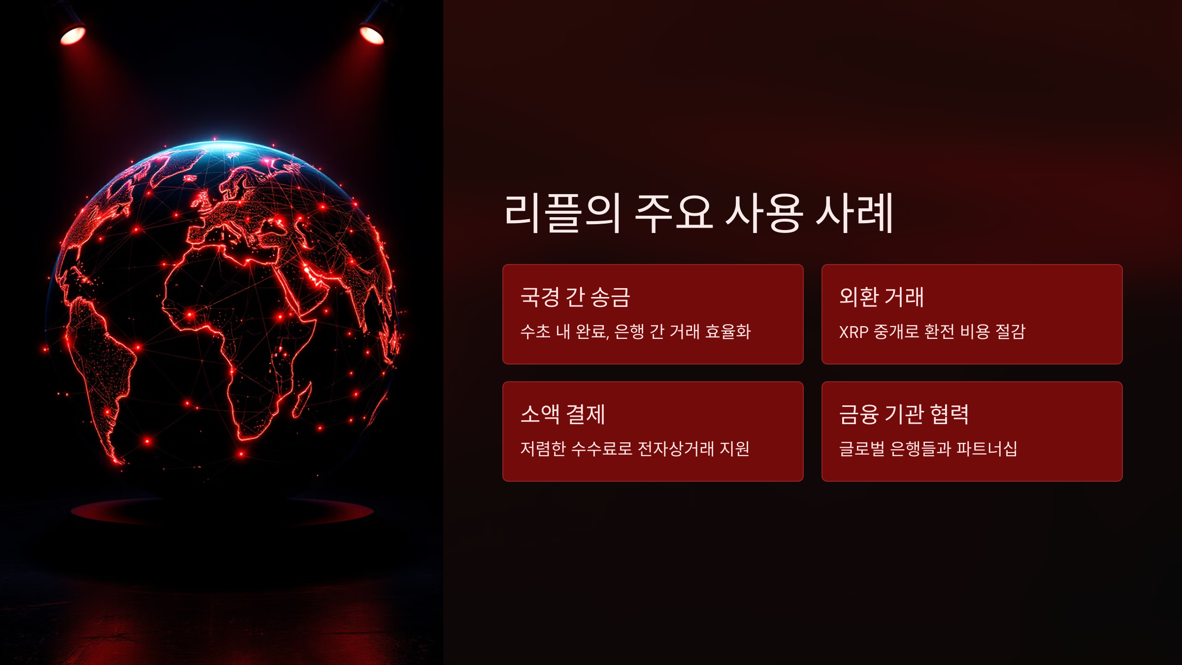 리플은 국경 간 송금을 간소화하며, 기존 시스템에서 수일이 걸리던 송금을 수초 내에 완료할 수 있습니다. 특히, 은행 간 거래에서 효율성을 크게 향상시킵니다.