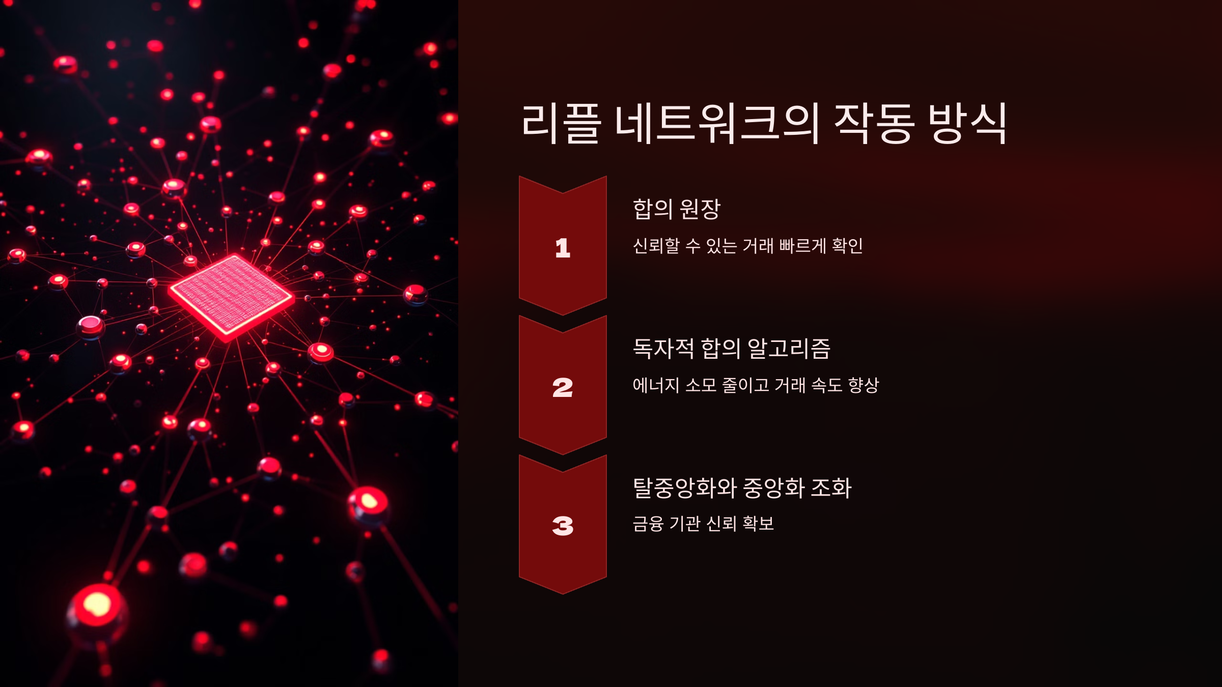 리플 네트워크는 기존의 블록체인과는 다른 독특한 합의 알고리즘을 사용합니다. 리플은 **합의 원장(Consensus Ledger)**을 기반으로 하며, 이는 은행과 금융 기관이 신뢰할 수 있는 거래를 빠르게 확인하고 처리할 수 있도록 설계되었습니다.