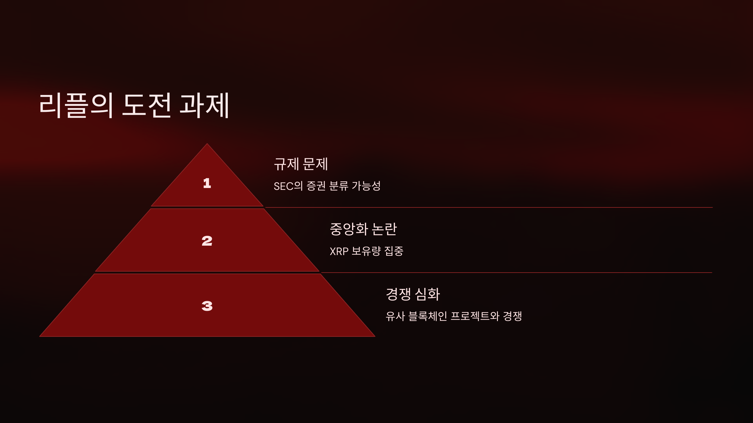 A5. 리플은 규제 문제, 중앙화 논란, 그리고 경쟁 심화와 같은 도전 과제에 직면해 있습니다. 특히, 미국 증권거래위원회(SEC)와의 법적 분쟁이 큰 이슈로 떠오르고 있습니다.
