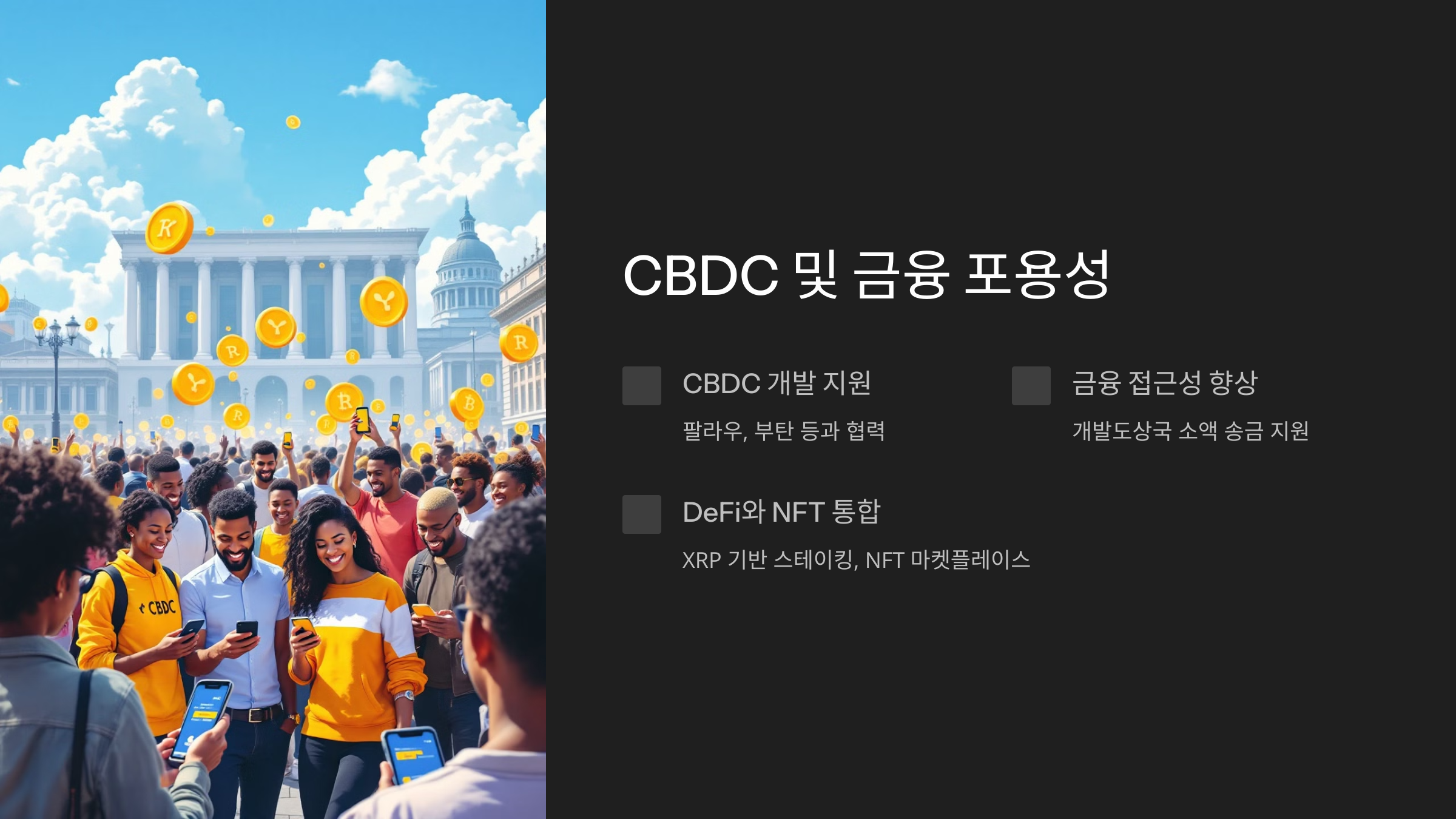 리플은 여러 중앙은행과 협력해 디지털 화폐(CBDC) 개발을 지원하고 있습니다. 리플의 **XRPL(리플 원장)**은 고속 트랜잭션, 보안성, 유연성으로 중앙은행에게 최적의 기술 플랫폼을 제공합니다.
