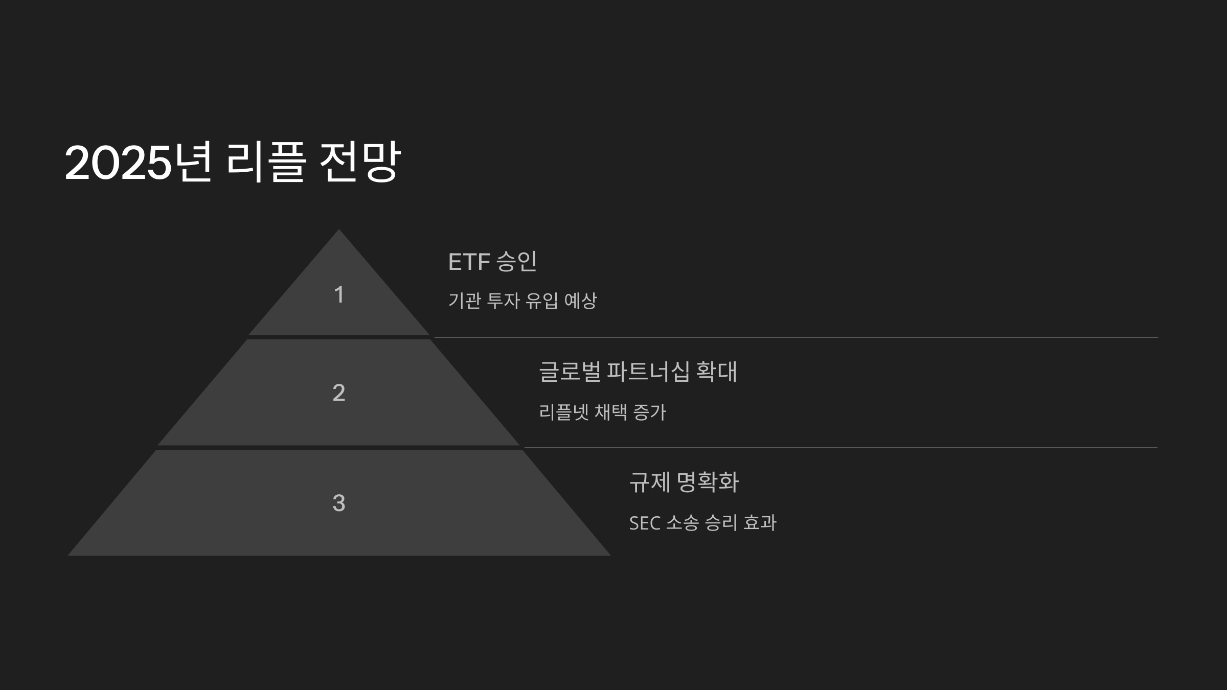 비트코인 현물 ETF가 승인된 이후, XRP ETF도 2025년 상반기에 승인될 가능성이 높게 점쳐지고 있습니다. 이는 대규모 기관 투자 자금을 끌어들일 수 있는 중요한 계기가 될 것입니다.