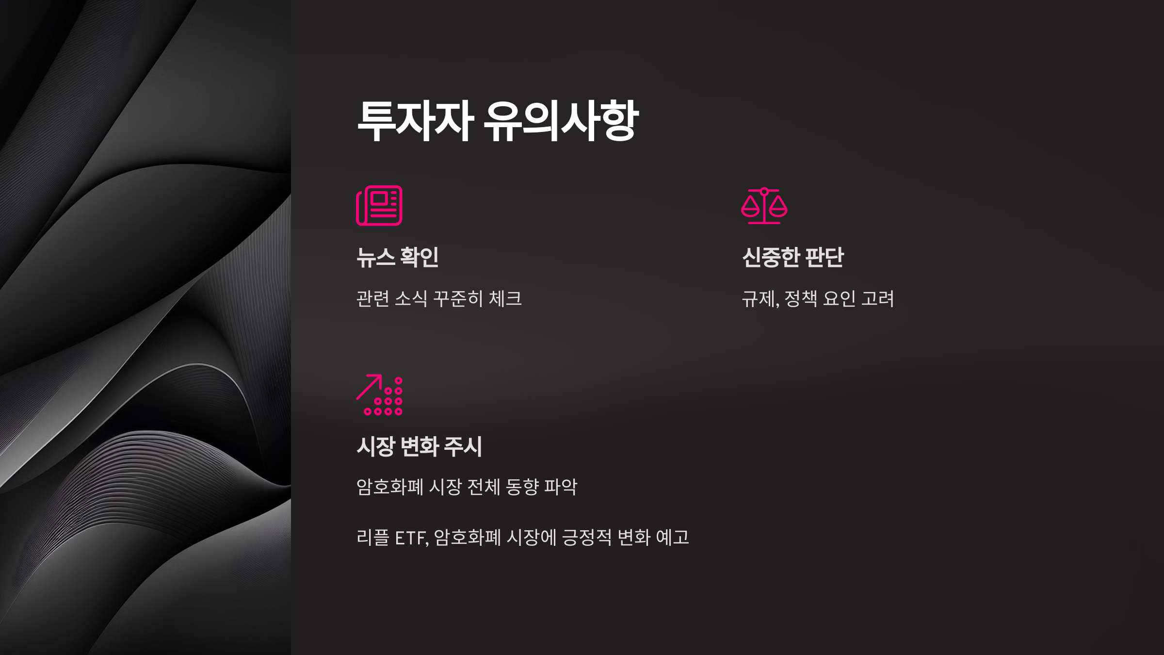 이는 리플뿐만 아니라 전체 시장의 신뢰도를 높이고, 제도권 금융과 암호화폐의 연결 고리를 강화할 수 있는 기회가 될 것입니다. 다만, ETF 승인은 여전히 규제와 정책적인 요인에 따라 결정되므로, 투자자들은 관련 뉴스를 꾸준히 확인하며 신중한 판단을 내려야 합니다.