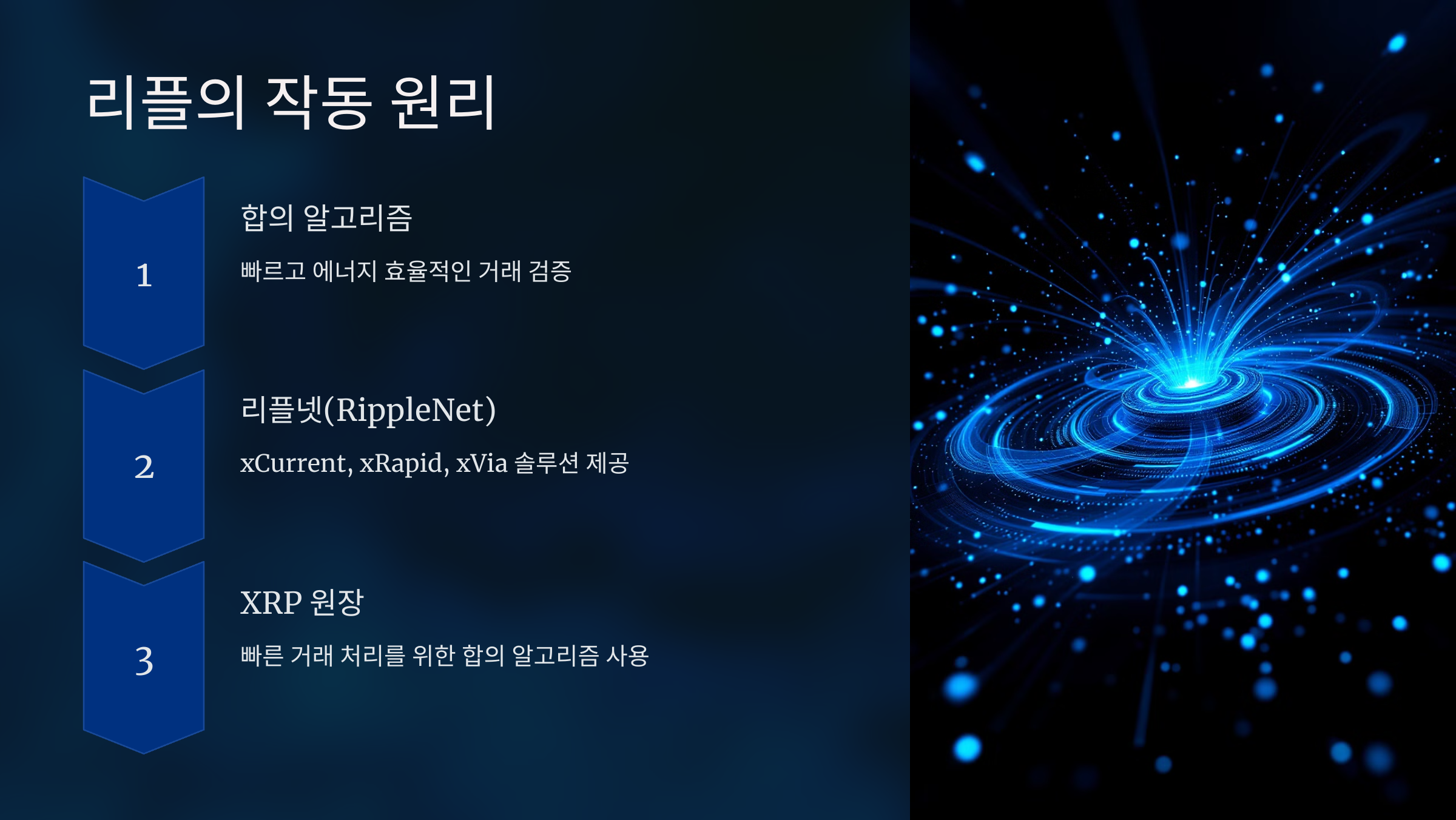리플은 기존 블록체인과는 다르게 **합의 알고리즘(Consensus Algorithm)**을 사용하여 거래를 검증합니다. 이를 통해 작업 증명(PoW)을 사용하는 비트코인보다 훨씬 빠르고 에너지 효율적인 방식으로 작동합니다.
