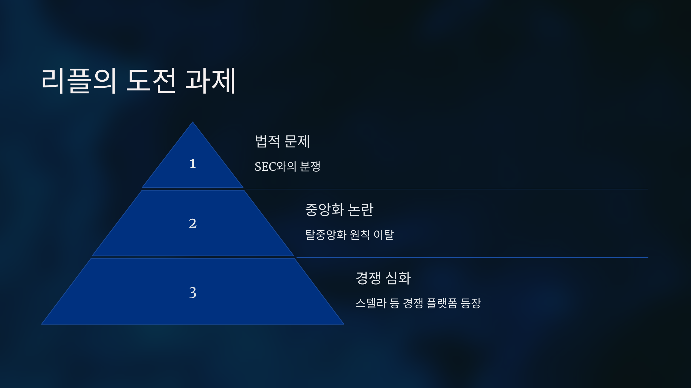 리플은 블록체인의 탈중앙화 원칙에서 벗어난 중앙화된 접근 방식을 취하고 있어, 일부 사용자들로부터 비판을 받고 있습니다. - 경쟁 심화
