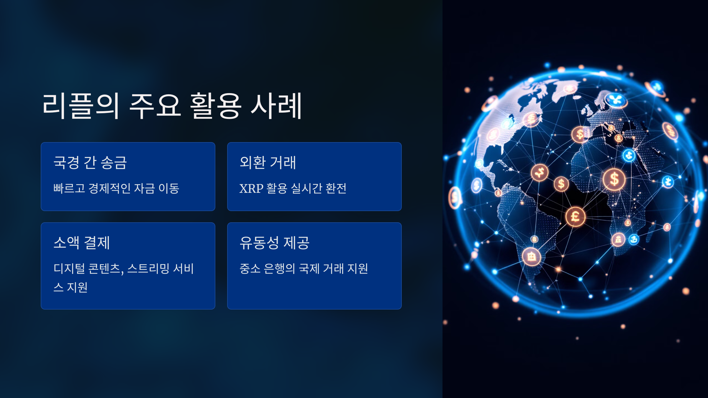 리플은 전통적인 송금 방식에서 발생하는 높은 비용과 긴 처리 시간을 혁신적으로 단축합니다. 특히, 소규모 기업과 개인이 빠르고 경제적으로 자금을 이동할 수 있도록 돕습니다. - 외환 거래