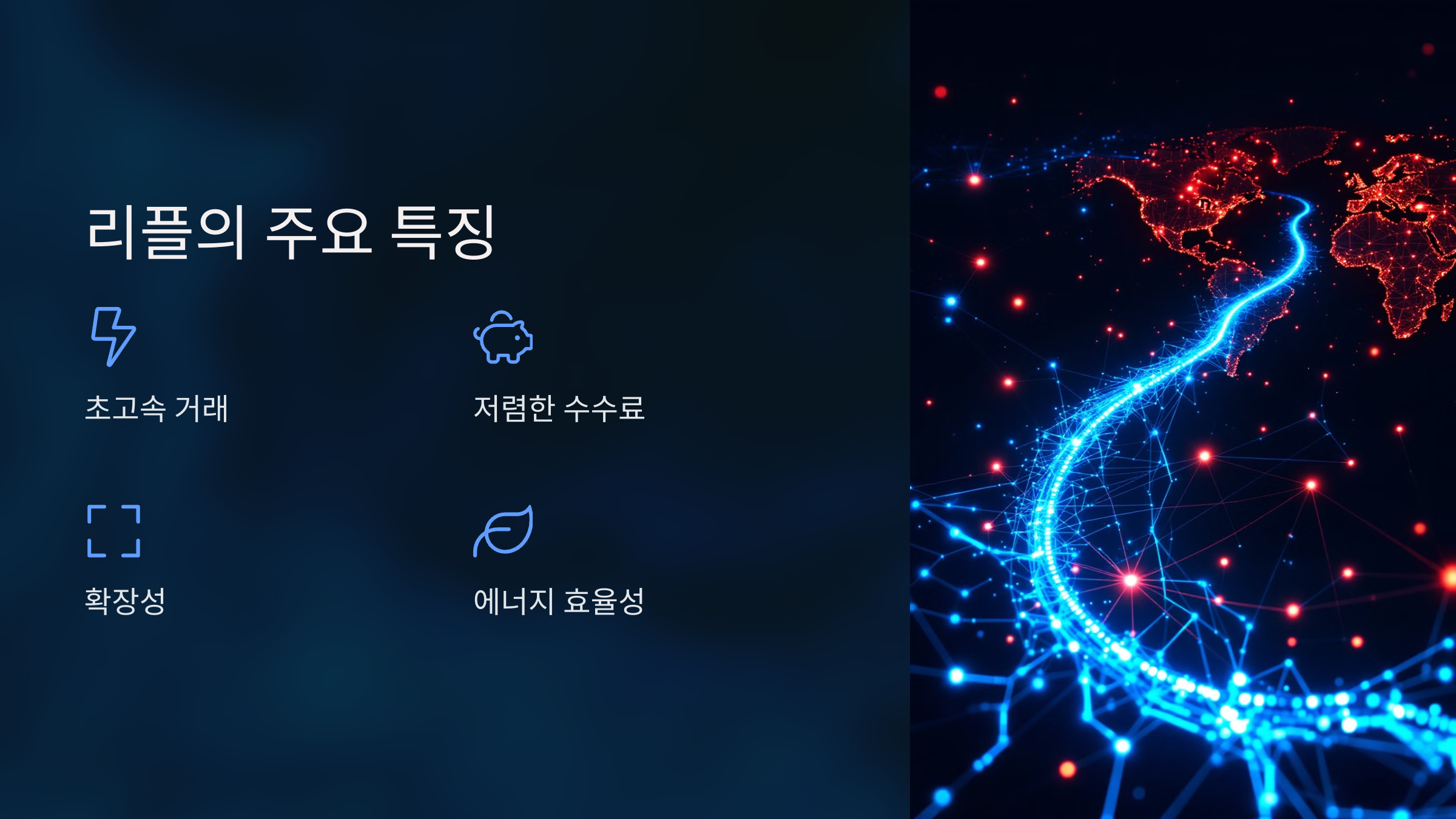 리플은 초당 1,500건 이상의 거래를 처리할 수 있습니다. 이는 비트코인(7건)이나 이더리움(15~30건)보다 훨씬 높은 수치로, 대규모 사용에 적합합니다. - 에너지 효율성