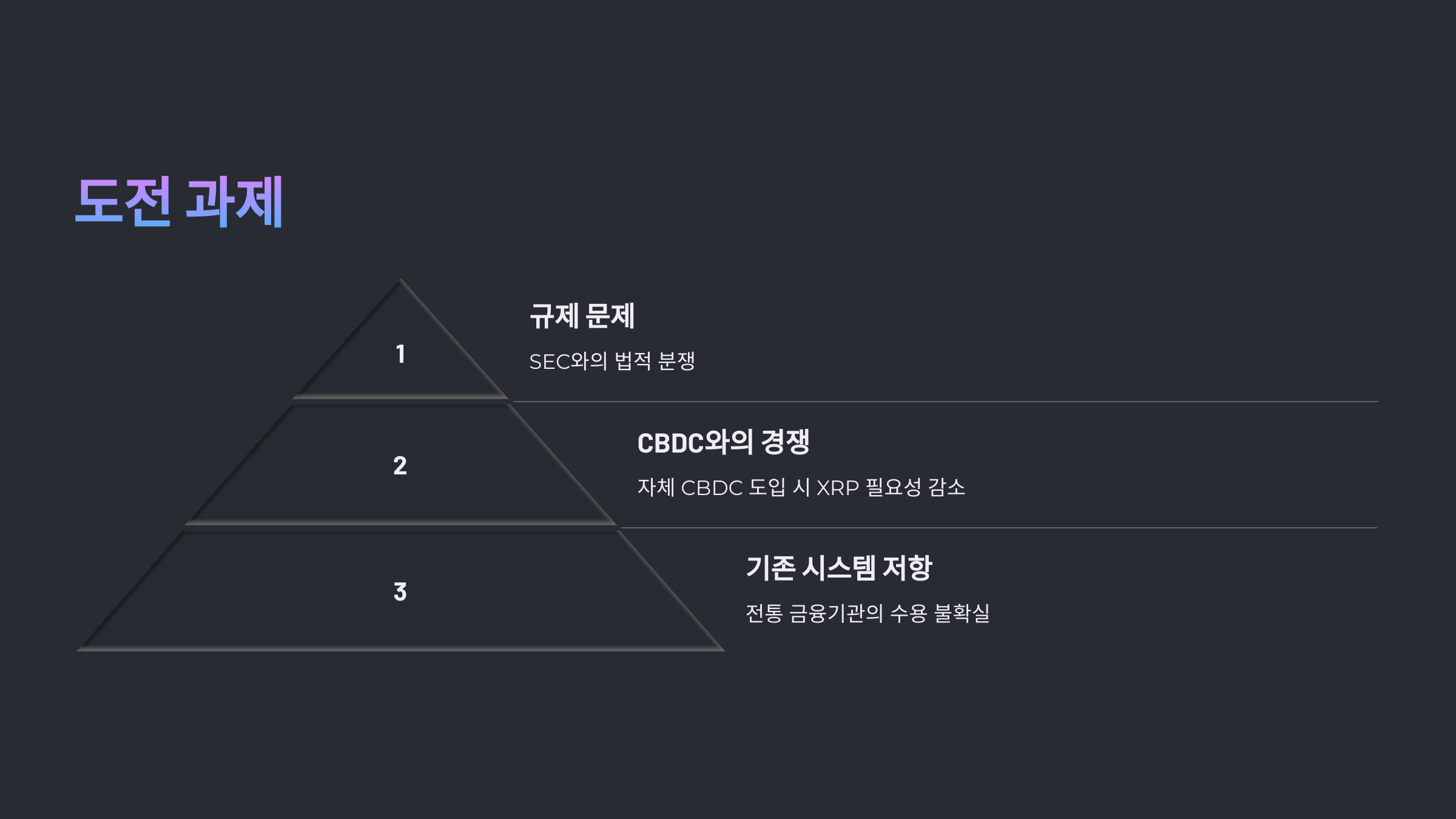 📌 CBDC와의 경쟁: 각국이 자체 CBDC를 도입할 경우 XRP의 필요성이 줄어들 가능성.
