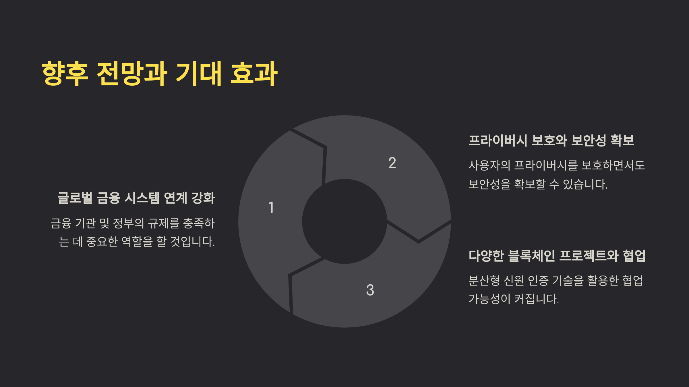 - 분산형 신원 관리(DID, Decentralized Identity): 사용자가 자신의 신원을 직접 관리하고 검증할 수 있도록 지원
