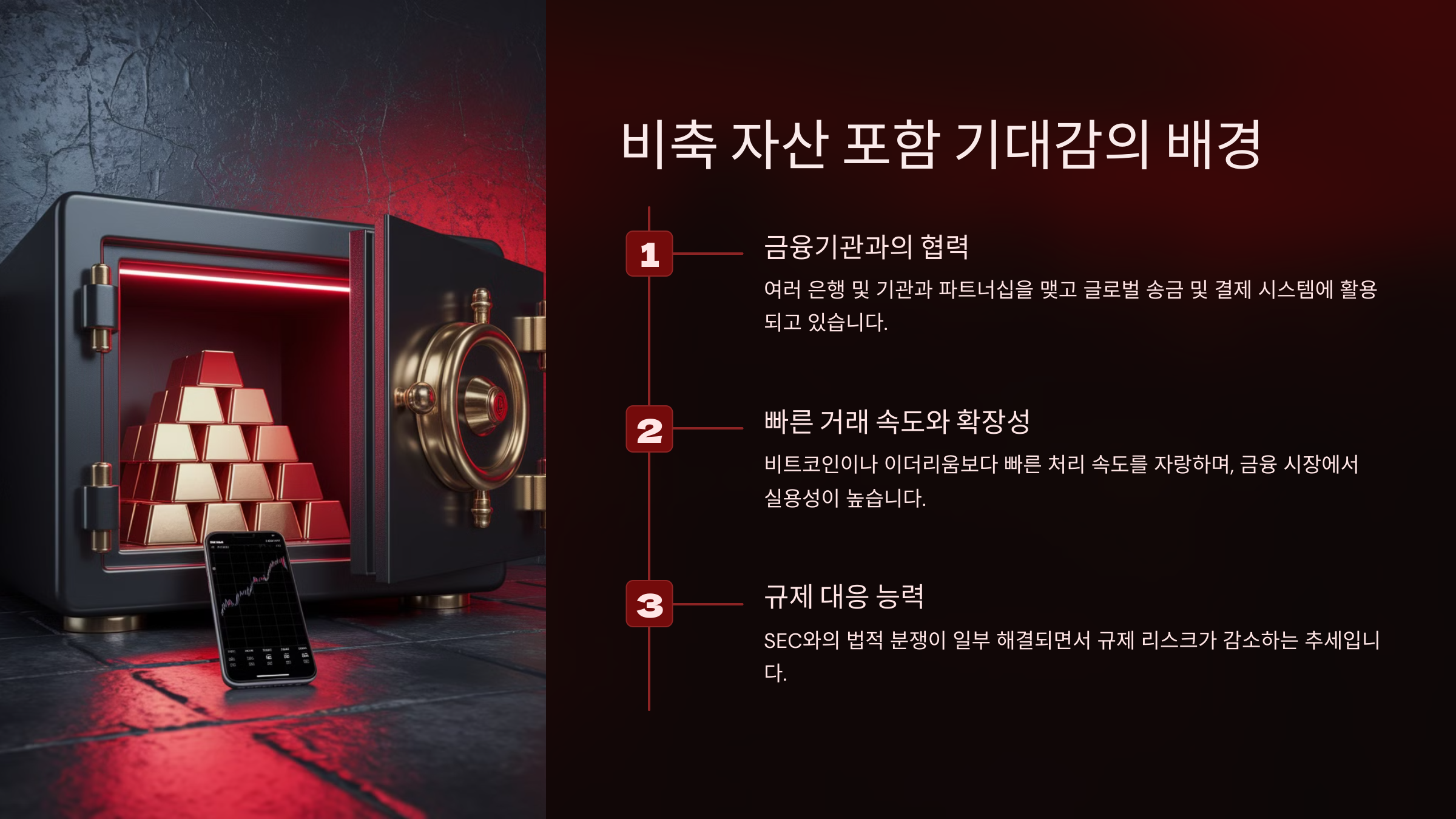 리플이 비축 자산으로 거론되는 이유는 다음과 같습니다.