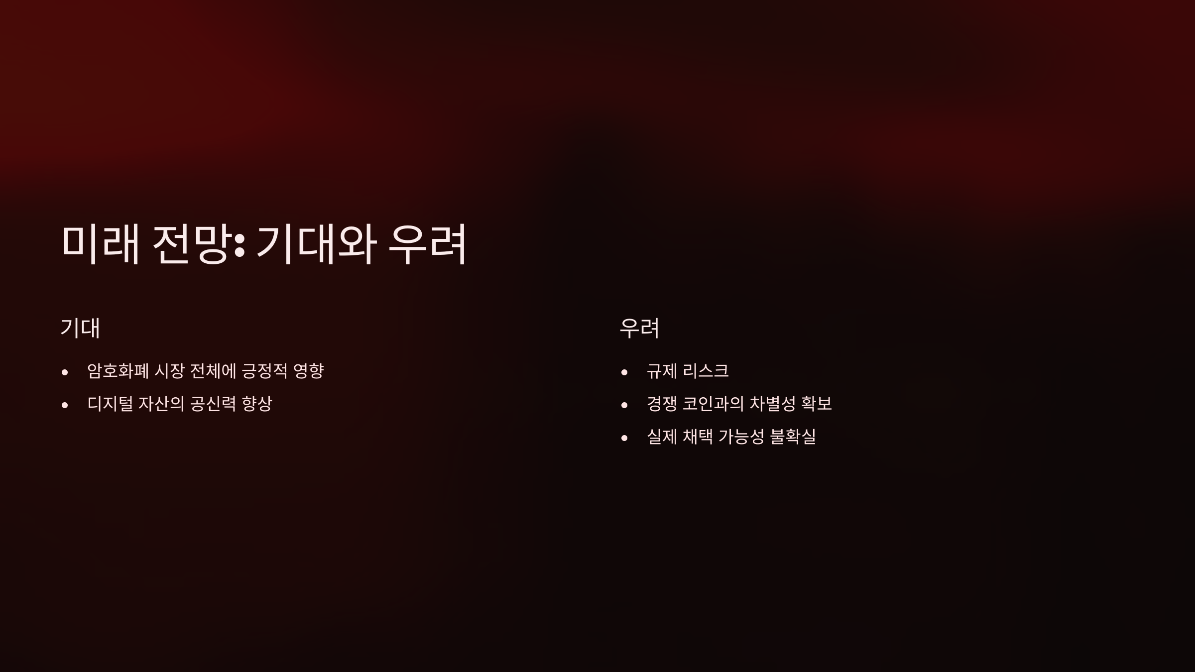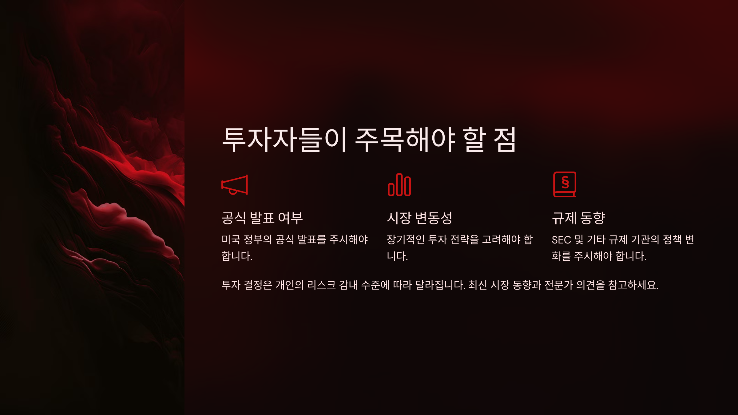 - 규제 리스크: 암호화폐 시장에 대한 정부의 정책 변화가 미칠 영향.