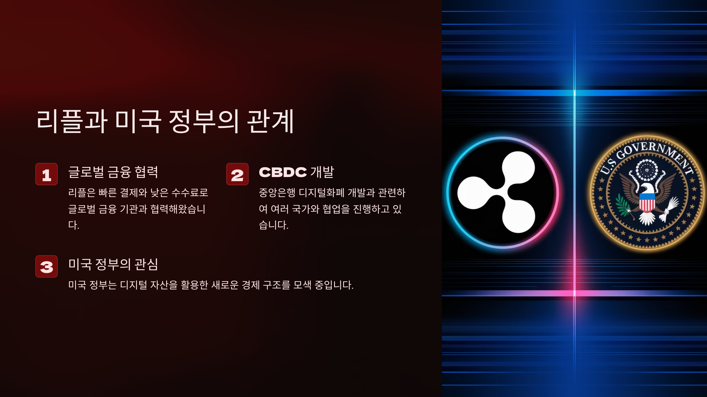 리플(XRP)은 빠른 결제 속도와 낮은 수수료로 인해 글로벌 금융 기관과 협력해온 암호화폐입니다. 특히 중앙은행 디지털화폐(CBDC) 개발과 관련하여 리플이 여러 국가의 금융기관과 협업을 진행하면서 미국 정부와의 연관성도 점점 주목받고 있습니다.