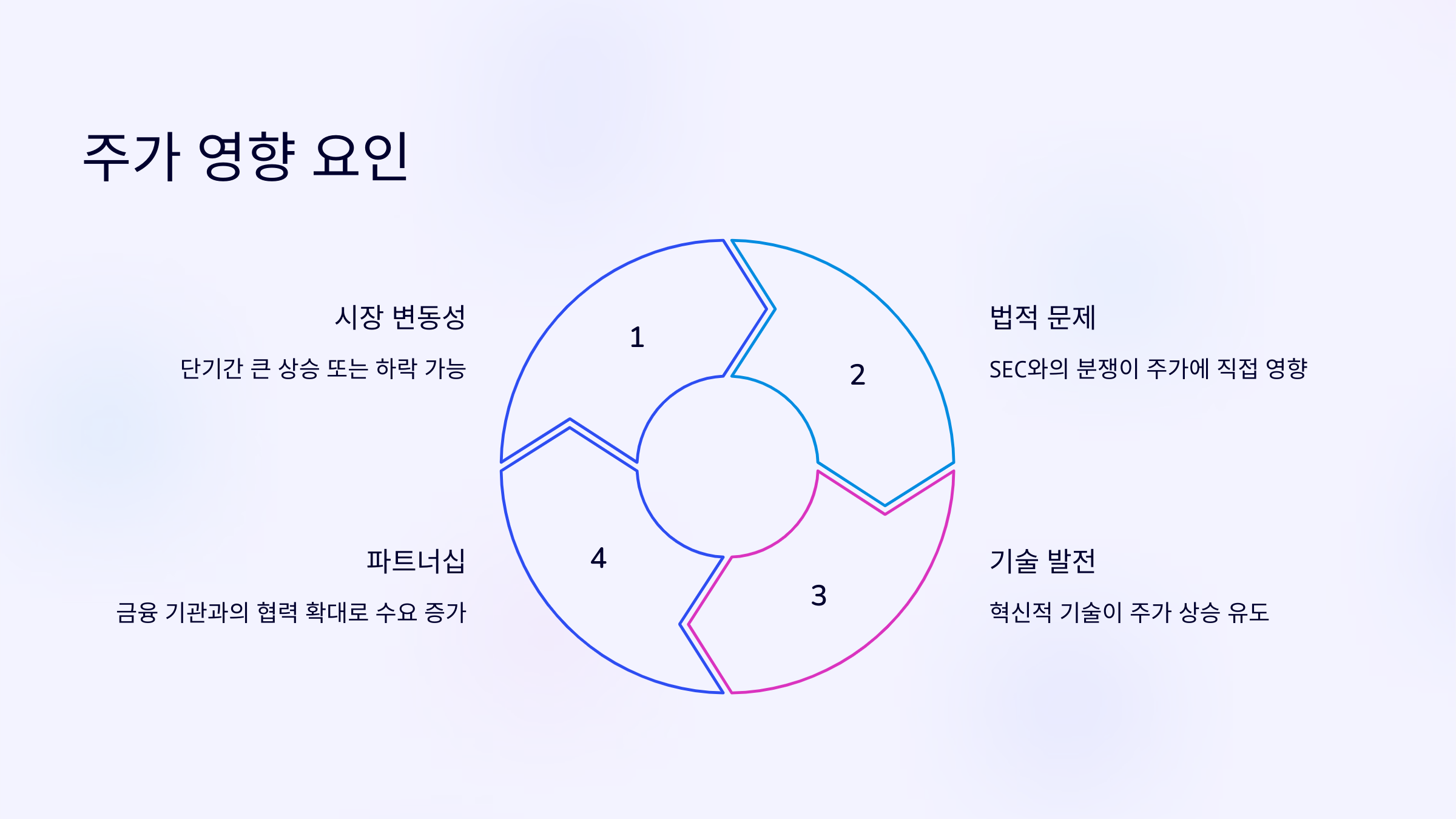 답: 리플(XRP)의 주가는 시장의 변동성, 법적 분쟁, 기술적 발전, 그리고 금융 기관들과의 파트너십 확대 등 여러 요인에 영향을 받습니다.