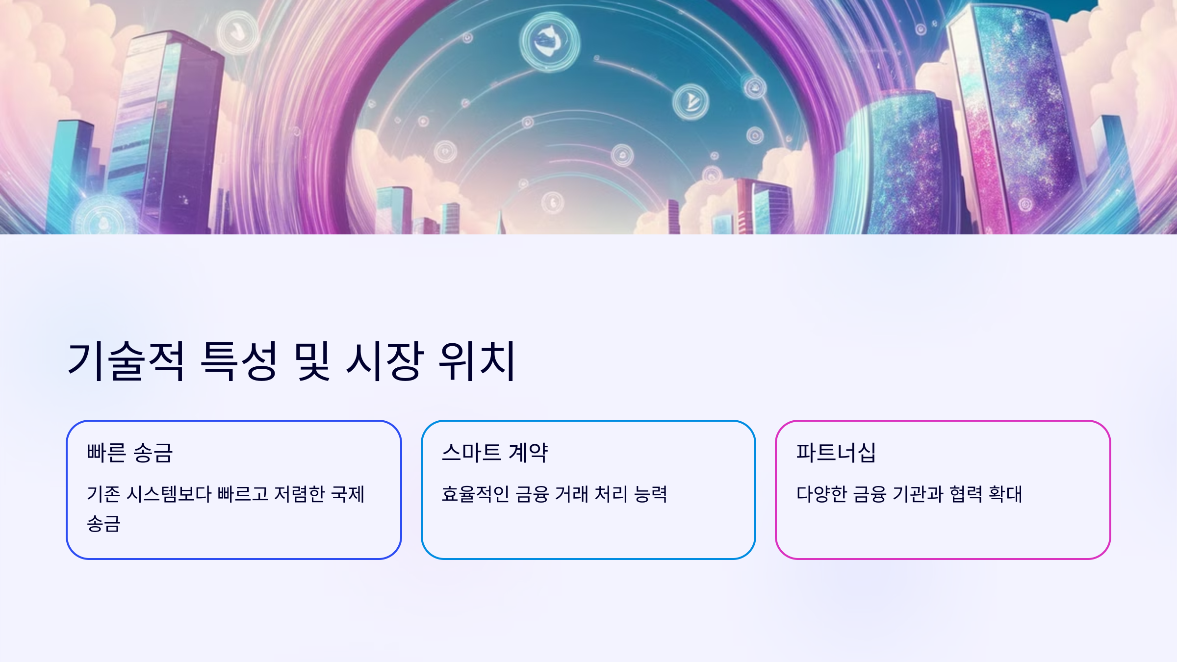 리플은 또한 스마트 계약 기능을 통해 금융 거래를 더 효율적으로 처리할 수 있는 능력을 가지고 있습니다. 이는 리플이 단순한 암호화폐를 넘어서, 실시간 국제 송금 시스템을 혁신할 수 있는 기술적 기반을 갖추고 있음을 의미합니다. 이러한 기술적 특성 덕분에 리플은 다양한 금융 기관들과 파트너십을 체결하고 있으며, 이는 리플의 가치를 높이는 요인으로 작용하고 있습니다.