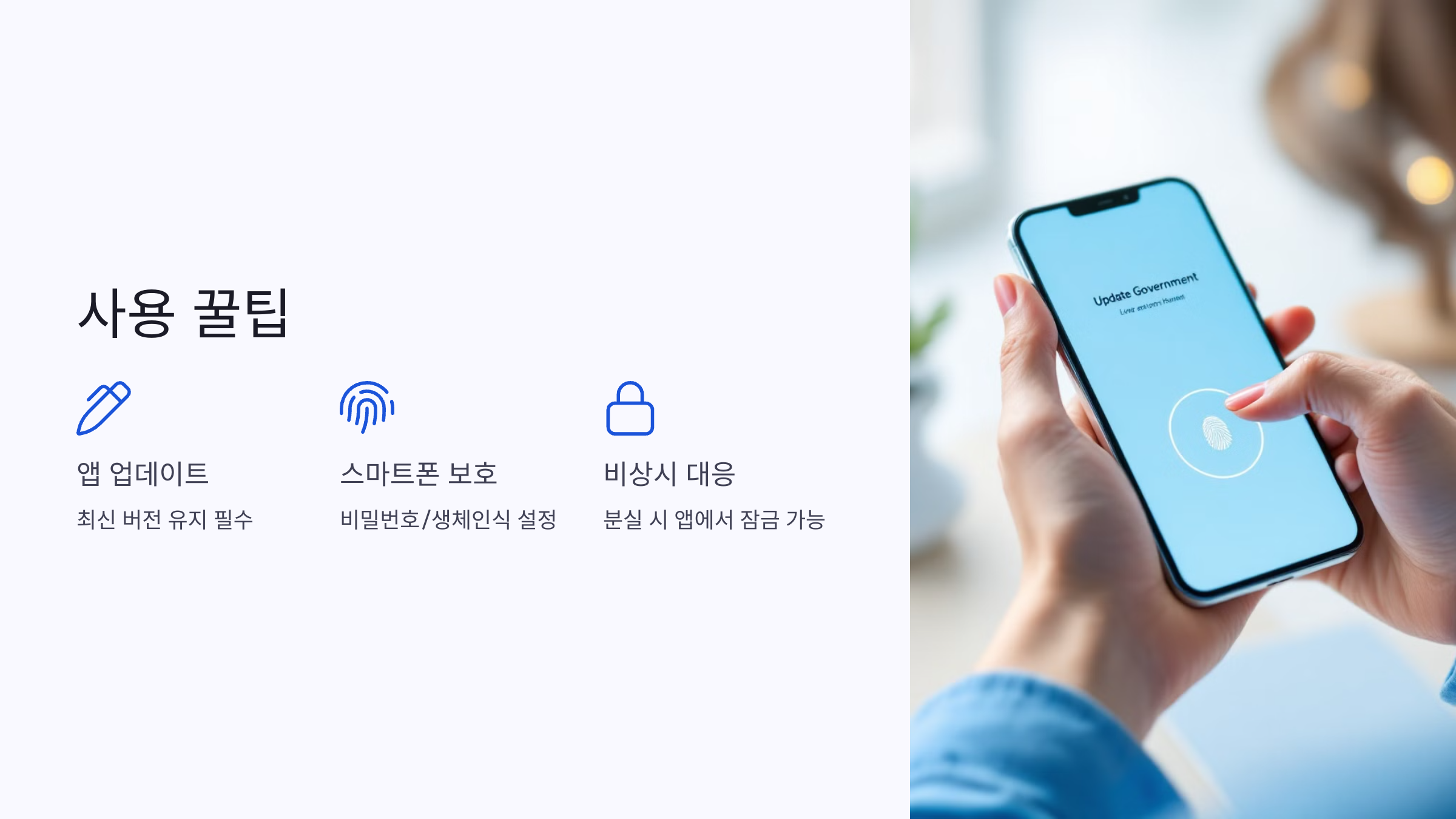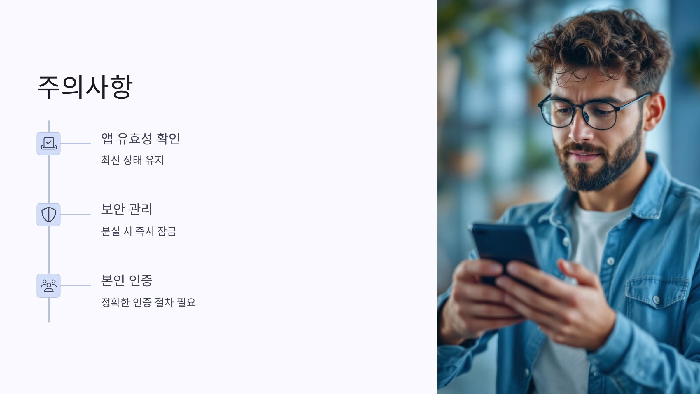 - 보안: 스마트폰 분실 시 즉시 모바일 공무원증을 잠그거나, 사용을 중지할 수 있는 기능을 활용하세요.